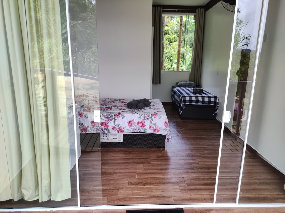 Dormir com o barulho suave do rio. Acordar com o canto dos pássaros. Descansar numa rede entre árvores. Relaxar numa piscina com água geladinha que vem de uma cachoeira. Ou simplesmente observar a natureza exuberante que nos cerca. E tudo isso com o conforto de nosso chalé completo, com cozinha privativa, banheiro, ar-condicionado, TV a cabo, varanda com rede, wi-fi e estacionamento. Estamos próximo de lindas cachoeiras e a poucos minutos de praias paradisíacas. Mercado a poucos metros.