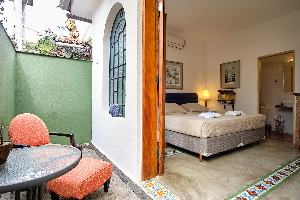 IMPORTANTE : O APARTAMENTO ESTÁ LOCALIZADO EMBAIXO DA VARANDA ONDE SERVIMOS O CAFÉ DA MANHÃ, PORTANTO PODE HAVER BARULHO. A pousada está situada a 5 minutos do centro histórico a pé e 2 minutos da praia.Temos a melhor vista panorâmica do mar e centro histórico de Paraty. Este apartamento possui 17m2 , TV Aberta, frigobar, ar condicionado split e wi-fi. Oferecemos delicioso café da manhã com linda vista para o mar.