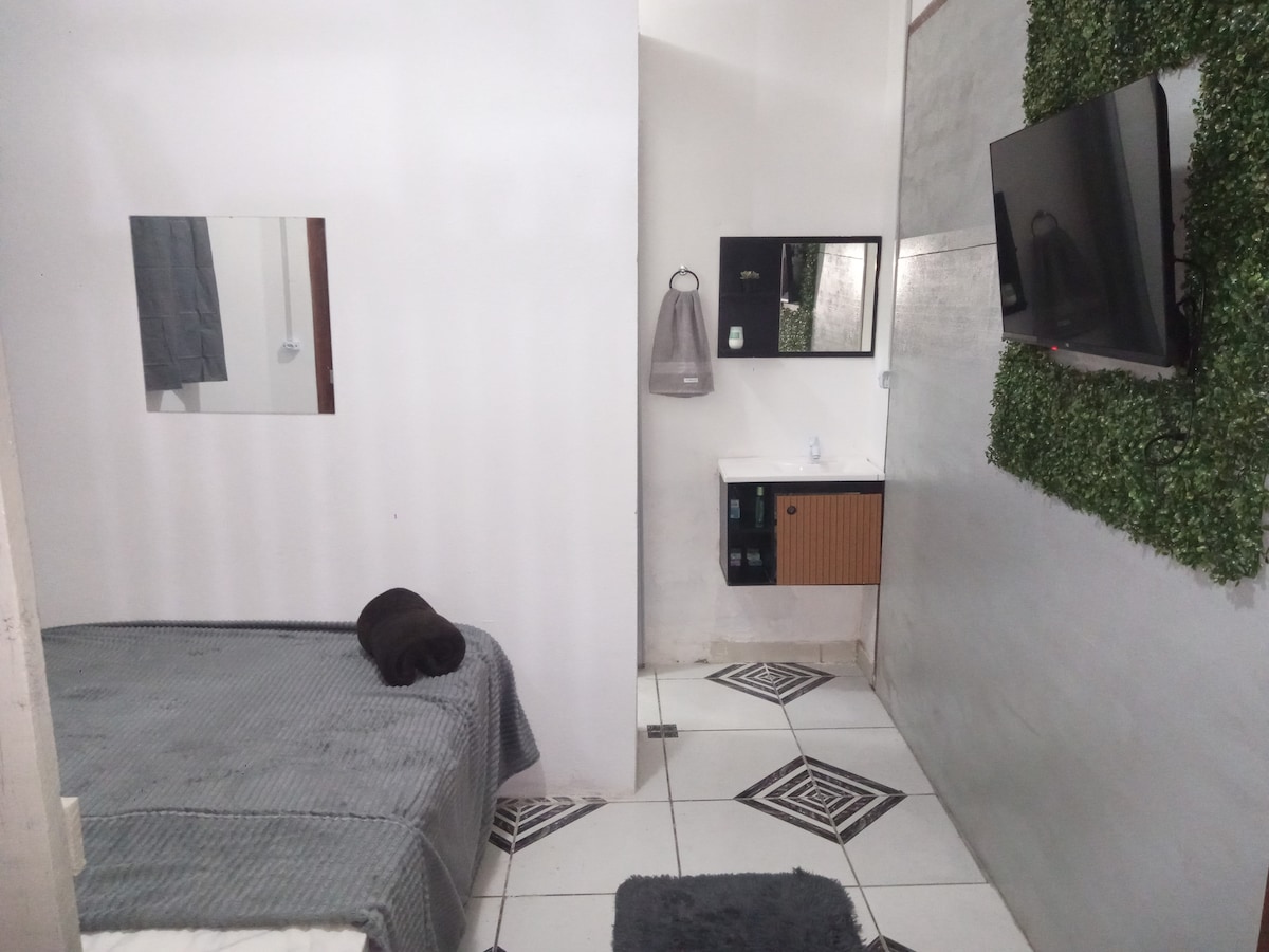 Linda suíte, com piscina com hidromassagem, garagem, churrasqueira, frigobar, fogão elétrico de duas bocas, utensílios de cozinha, forno elétrico e cafeteira. A suíte e as comodidades citadas, exceto a garagem, se localizam, de forma totalmente independente, na parte de trás da casa da minha família, onde resido eu, minha esposa e minha filha. Apenas o portão de acesso à rua, onde fica a garagem, é compartilhado. Fornecemos roupa de cama, toalhas de banho e de pisci