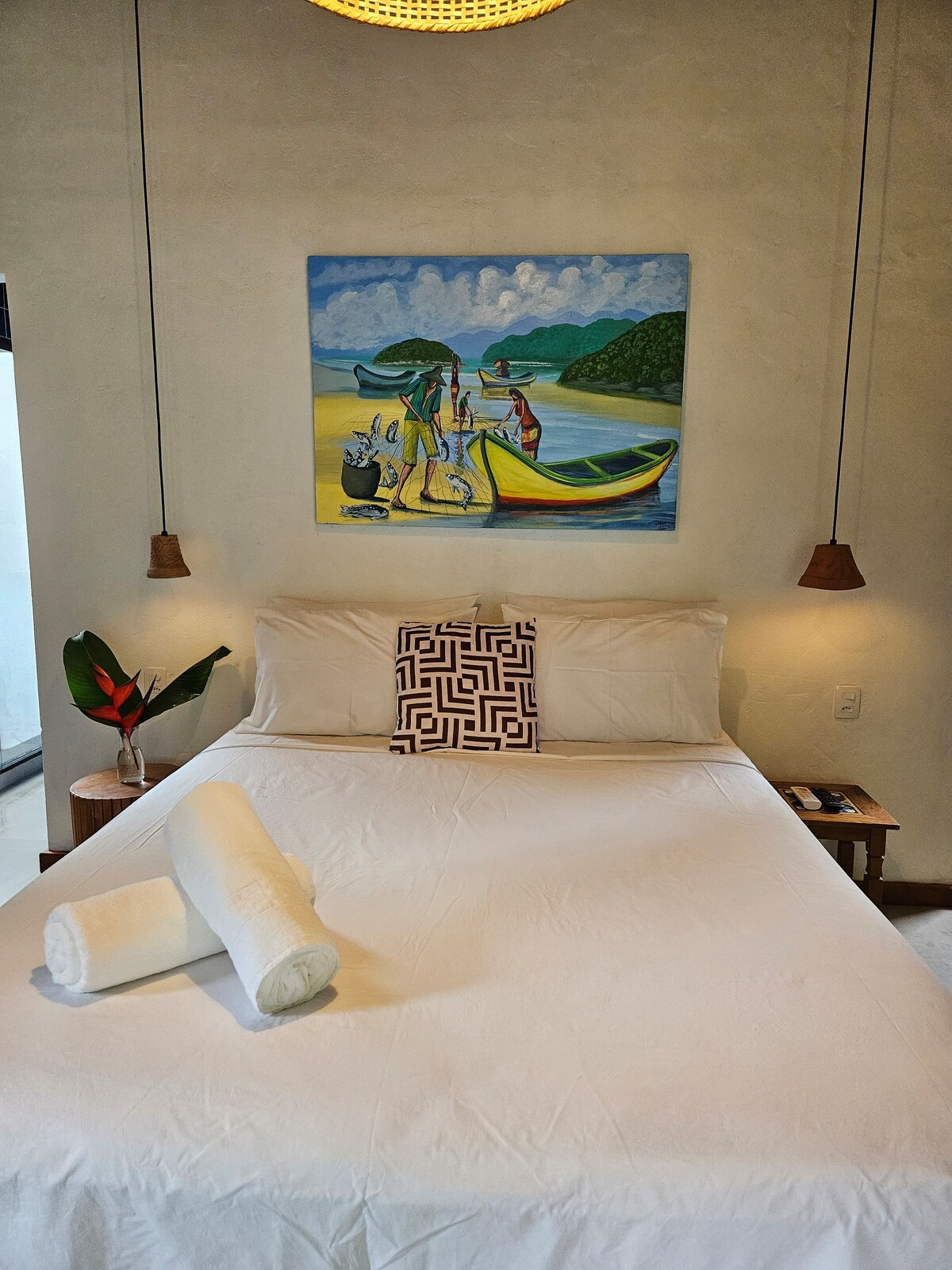 Uma casa cheia de artes localizada no coração do Centro Histórico de Paraty-RJ, idealizada por um casal apaixonado por cultura brasileira e nossas artes. A residência, perfeita para um casal, fica no primeiro andar de um sobrado histórico, na principal rua e quarteirão da cidade. O casarão foi recém reformado pelo próprio casal, tendo como premissa o respeito por sua história, as imperfeições de uma construção ancestral feita à mão, associada a um morar contemporâneo e com conforto.