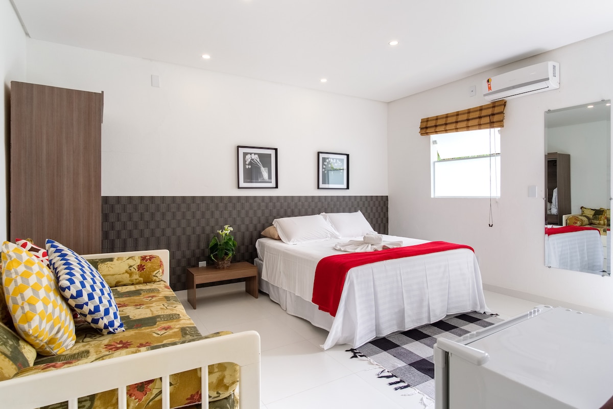 Embrace comfort in this peaceful, safe and beautifully located place, perfect for couples. Suíte Lilac is 100m from Praia do Pontal, 300m from the Historic Center and 1.5km from Paraty Bus Station. The suite offers a private bathroom with hot shower, air conditioning, ceiling fan, free Wi-Fi (440MB), flat screen TV 40", minibar, mirror, couple bed and bedside tables with lamps.
