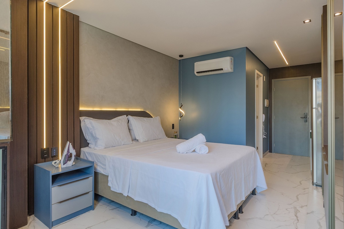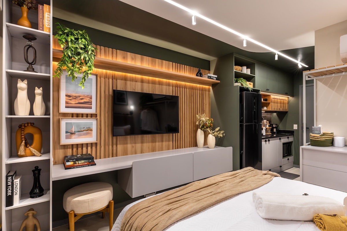 STUDIO COM UM ROOFTOP ESPETACULAR Planejado para oferecer uma estadia prática e aconchegante para clientes exigentes. -Cama de casal QUEEN Premium e enxoval. -TV 58” e canais a cabo com Filmes e Premiere para não perder os Jogos de seu time. -Cozinha com Cafeteira a cápsula Fogão,Microondas,Geladeira Duplex,Sanduicheira,Liquidificador,Purificador de Água Gelada, Ayrfrier; -Banheiro Moderno com Ducha de Água Quente revigorante, Secador de Cabelo. -Varanda com Mesa e cadeiras confortáveis.