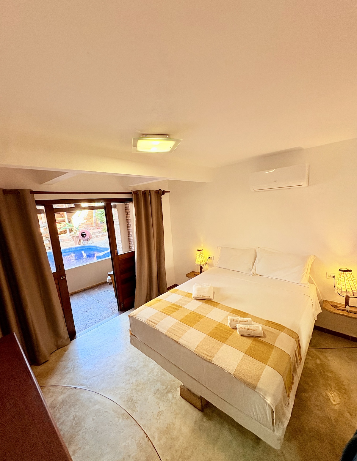 Nossa casa possui 2 quartos. O primeiro, com acesso pelo jardim frontal, vista da cama para o mar, cama queen, banheiro e pequena cozinha americana com fogão, geladeira e bancada O segundo , com 1 cama king e 1 cama de casal, banheiro e frigobar (sem cozinha), com acesso pelo jardim lateral Ambos com ventilador de teto e ar condicionado Os quartos são interligados por 1 porta interna e também possuem acesso independente Piscina térrea profundidade 1,50m Pequena piscina infantil no mirante
