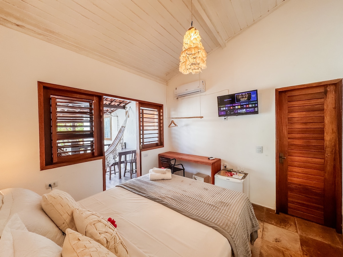 O grupo terá fácil acesso a tudo o que precisar neste espaço com excelente localização. A casa acomoda até 4 hóspedes. Composição do espaço: • 1 suíte com 2 camas de casal • Mesa para refeições • Mini cozinha equipada com liquidificador, sanduicheira e air fryer Não servimos café da manhã. Observações: Não disponibilizamos lençóis para uso pessoal e toalhas de banho. Ambiente aconchegante, confortável e muito bem localizado para você curtir o melhor de Jericoacoara 🌊🌴