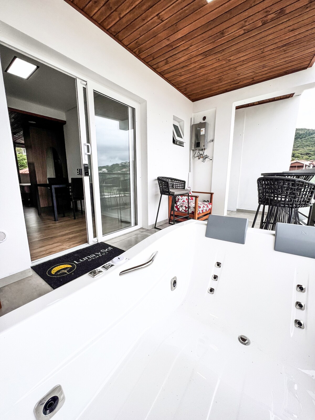 Vila Avalon is the top-floor apartment of the villa, featuring a spacious balcony with a breathtaking panoramic view of Vale do Rosa, Ibiraquera Lagoon, and the ocean 🌅✨. The access includes 600 meters of unpaved road, though flat. Perfect for couples looking to escape the hustle and bustle of the city, this space offers tranquility surrounded by lush nature 🌿💙. The apartment includes a fully equipped kitchen and an outdoor heated jacuzzi, ideal for relaxing moments under the starry sky 💫🛁.