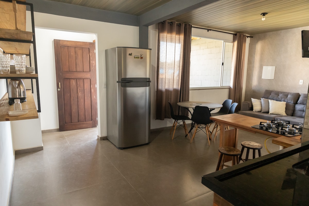 Suíte com 2 ambientes, amplo banheiro (Sem Jacuzzi), varanda, cozinha com fogão de indução 1 boca, frigobar, microondas, cafeteira, chaleira elétrica e utensílios. Há 1 cama de casal e 1 cama auxíliar para até 4 pessoas. O apê possui ainda: mesa para trabalho e refeições, guarda-roupas e Wifi estável. Fornecemos roupa de cama e toalhas para todos os hóspedes. É perfeita para viajantes solo, casais com ou sem filhos. Localização: - Na rua principal do centrinho do Rosa - 1,3 km da Praia do Rosa