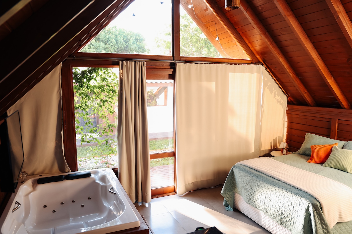 A “Cabana Refúgio do Rosa” fica a 800m do centrinho do Rosa. SOZINHA num terreno de 200m2, e tudo é privativo para o seu grupo. Piscina privativa com 2 pontos de Hidro, Cascata e Led. Deck de 30m2 com Fogo de Chão. Churrasqueira privativa coberta do lado da piscina. Banheira de Hidromassagem Interna dupla e Aquecida. Quadra de Areia Iluminada COMPARTILHADA com mais uma casa. O Mezanino possui uma cama Queem e embaixo há uma cama de casal. Cabem 2 hóspedes extras em 2 colchões extras.
