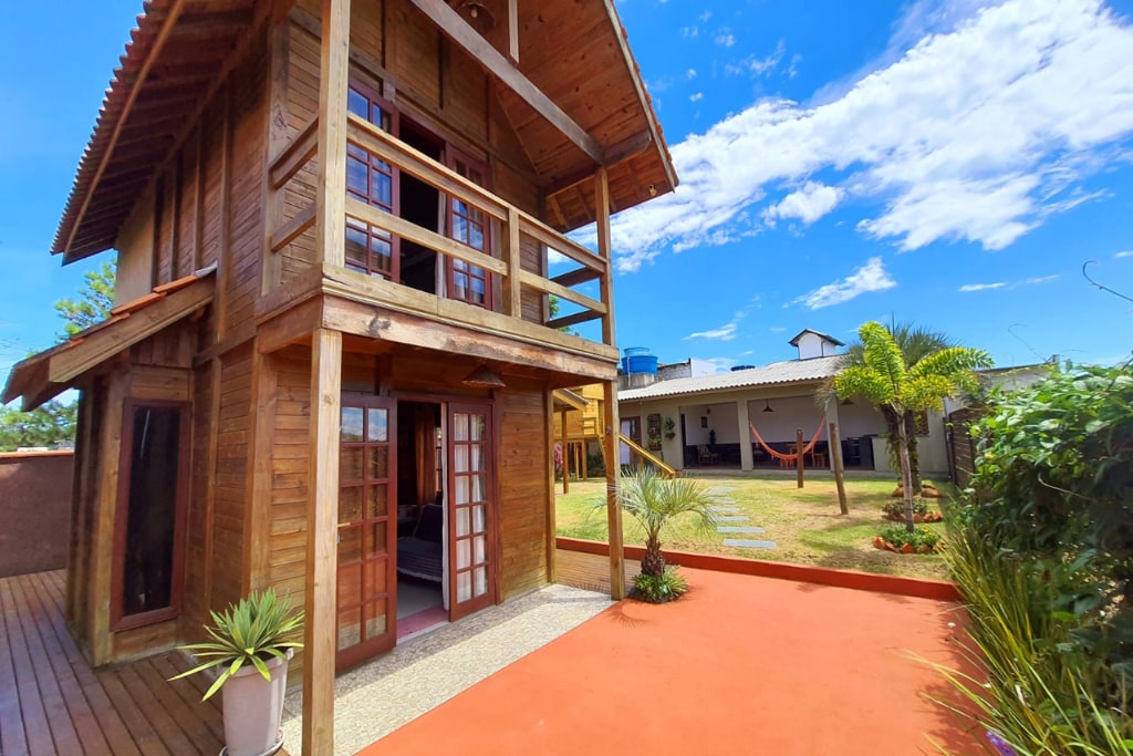 Chalé em madeira, com uma cama de casal no mezanino e uma bicama no estar com dois colchões de solteiro, cozinha completa, banheiro, estar, varanda em L com rede e churrasqueira, ar condicionado 22K, Wifi 60MB com fibra óptica, tv 32 smart , microondas, sanduícheira, liquidificador, cafeteira elétrica, garagem e uma ampla vista para o mar e para a serra.