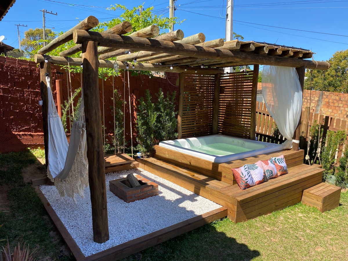 A “Casa Sonho do Rosa” fica a 1.4km do centrinho do Rosa e menos de 1km do Mar Del Rosa. Estamos sozinhos num terreno de 450m2, tudo privativo para você e seu grupo. Jacuzzi Aquecida para até 8 pessoas. Quadra de Areia iluminada. Piscina com Hidro, Cascata e Led. Pergolado no gramado com balanço, lareira de chão. Deck com pergolado coberto e churrasqueira. São 2 quartos: No primeiro temos um cama Queem. No segundo temos uma cama de casal + bicama. Na sala cabem 2 hóspedes extras.