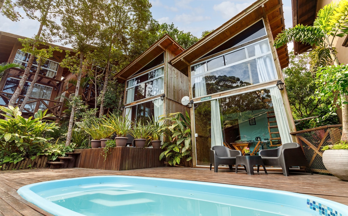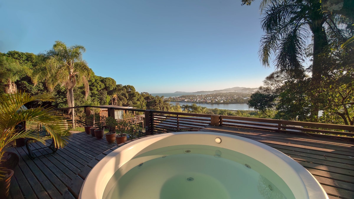 Desfrute do refúgio EXCLUSIVO E PRIVATIVO com ofurô AQUECIDO, em meio à um bosque com VISUAL espetacular do pôr-do-sol na Lagoa Encantada . As suítes possuem ar condicionado, TV e Wi-fi 600MB Ofurô aquecido e com hidromassagem. Quiosque Espaço Gourmet completo. São duas suítes, uma com uma cama de casal e a outra com duas camas de casal, não alugamos separadamente . Próximo da praia e do centrinho. Acesso à Praia por trilha ou escadaria exclusiva, um belo exercício para o corpo e alma.