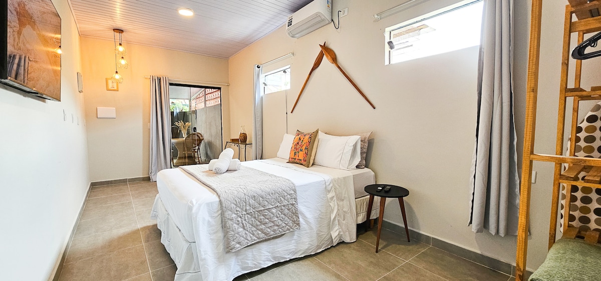 Espaço inteiro sala quarto banheiro cozinha completa varanda. Fica no alto Praia Vermelha Centro linda vista p o mar e praia q fica a 5min a pé. Perto praia Tenório Praia Grande e Cedrinho. Rodeado pela floresta integrado na natureza ideal p pessoas que gostem de silêncio privacidade praticar yoga surf caminhadas. Sol nasce em frente à casa q tem lindo terraço ensolarado em meio à copa das árvores. Acordar c os passarinhos. Perto comércio Itaguá c restaurantes supermercados farmácias lojas.