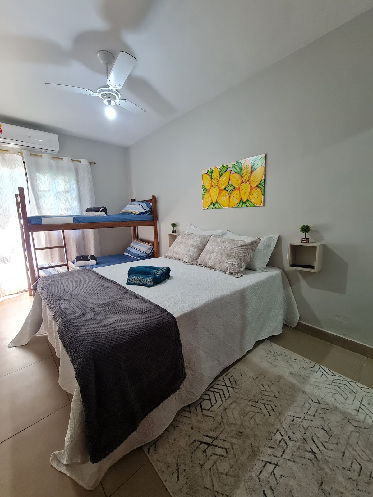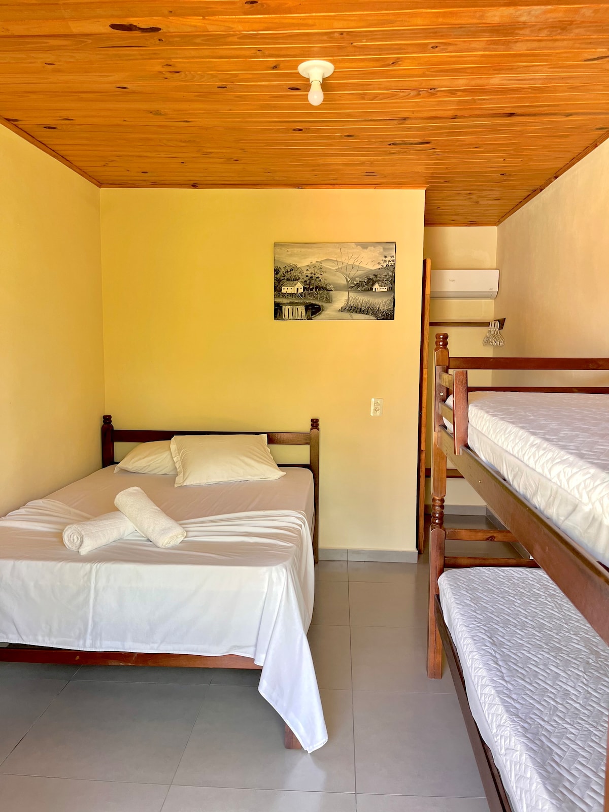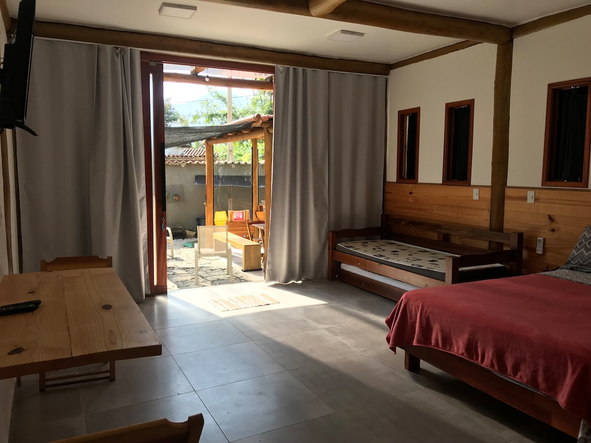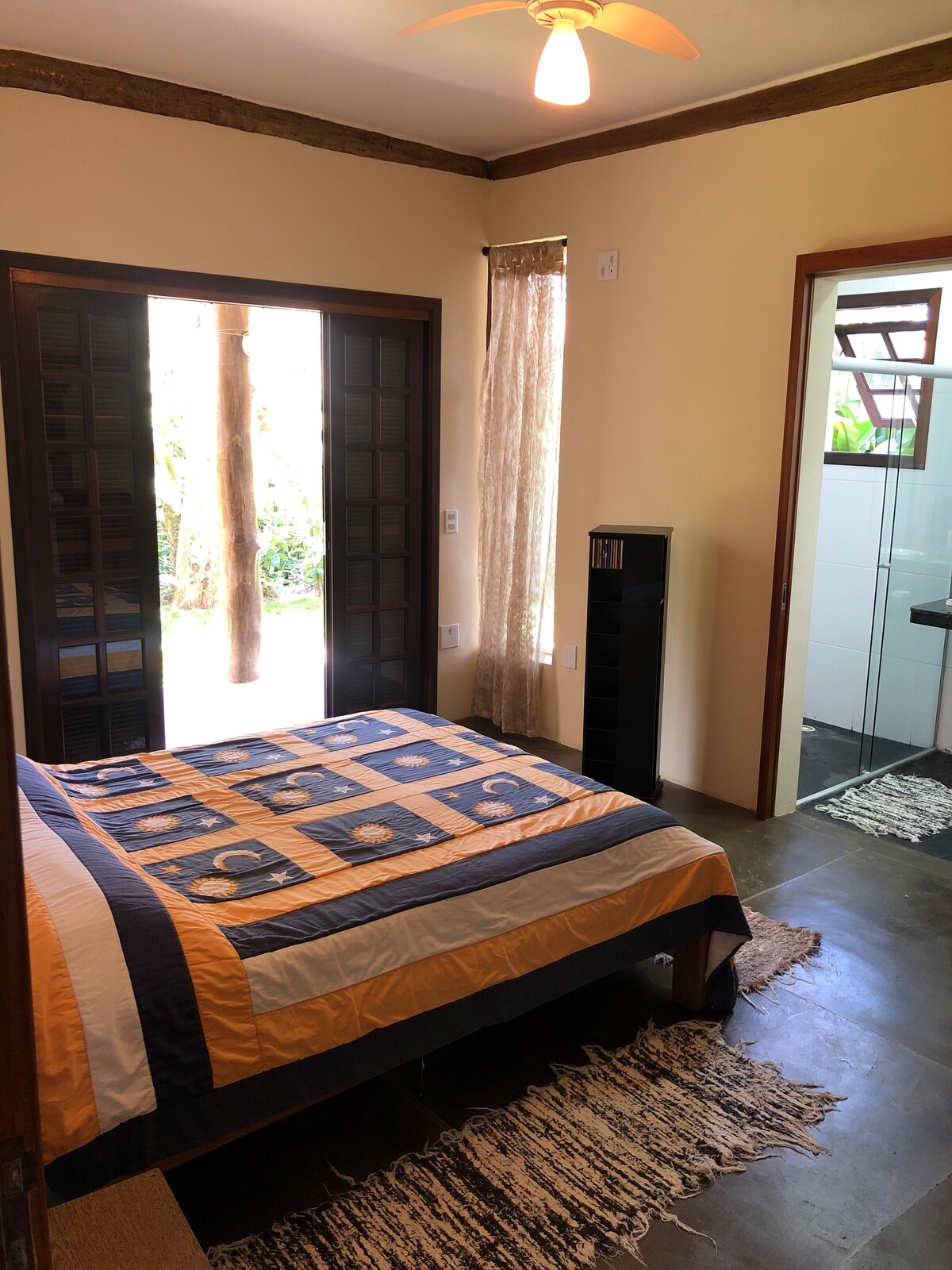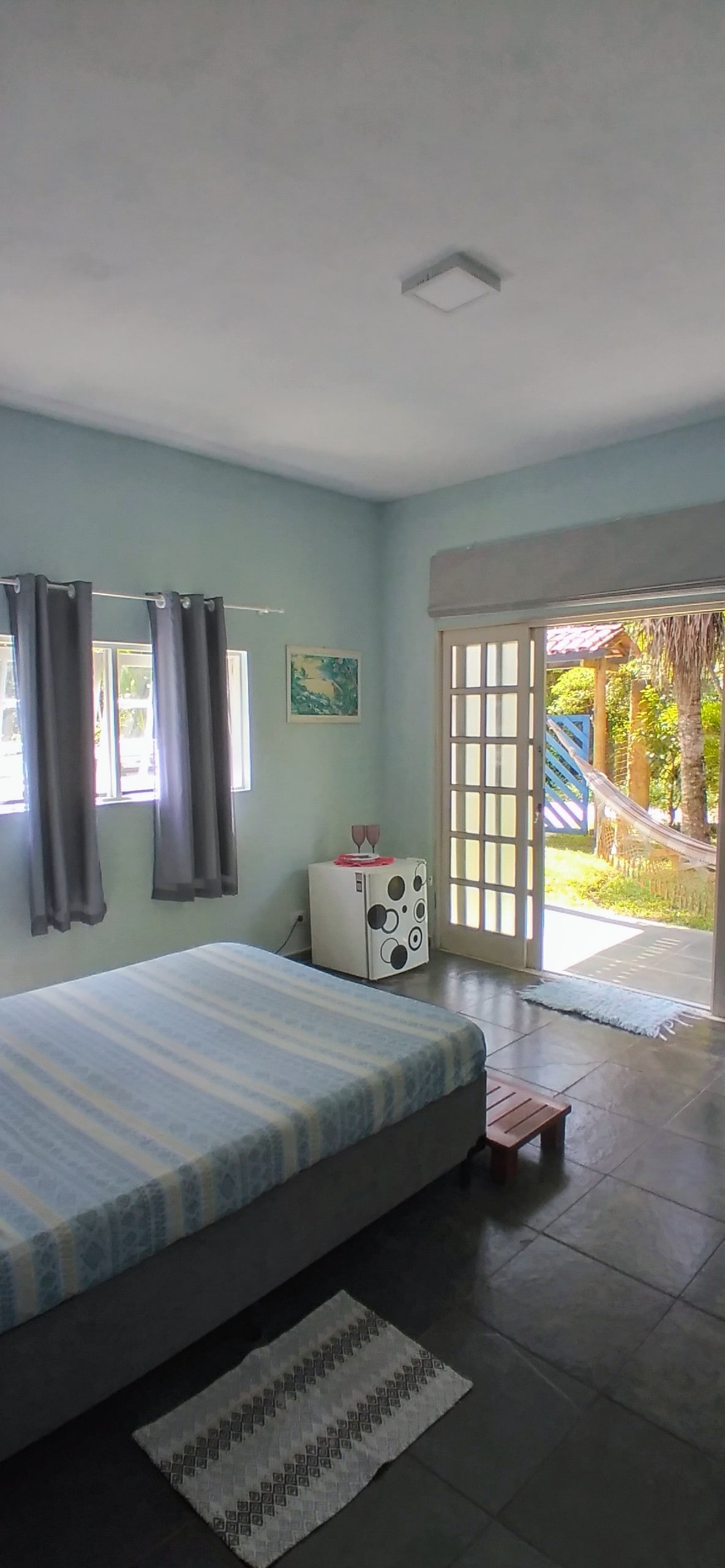 Suíte de hóspedes para 1 casal com varanda, entrada privativa, frigobar e estacionamento O espaço interno é amplo, bem arejado e iluminado, proporcionando uma atmosfera acolhedora e relaxante. Para sua comodidade, a suíte dispõe de frigobar, perfeito para guardar suas bebidas e lanches. Localizada a poucos metros da praia e do rio, a região oferece excelentes opções de lazer, como surf, caiaque e passeios ao ar livre.