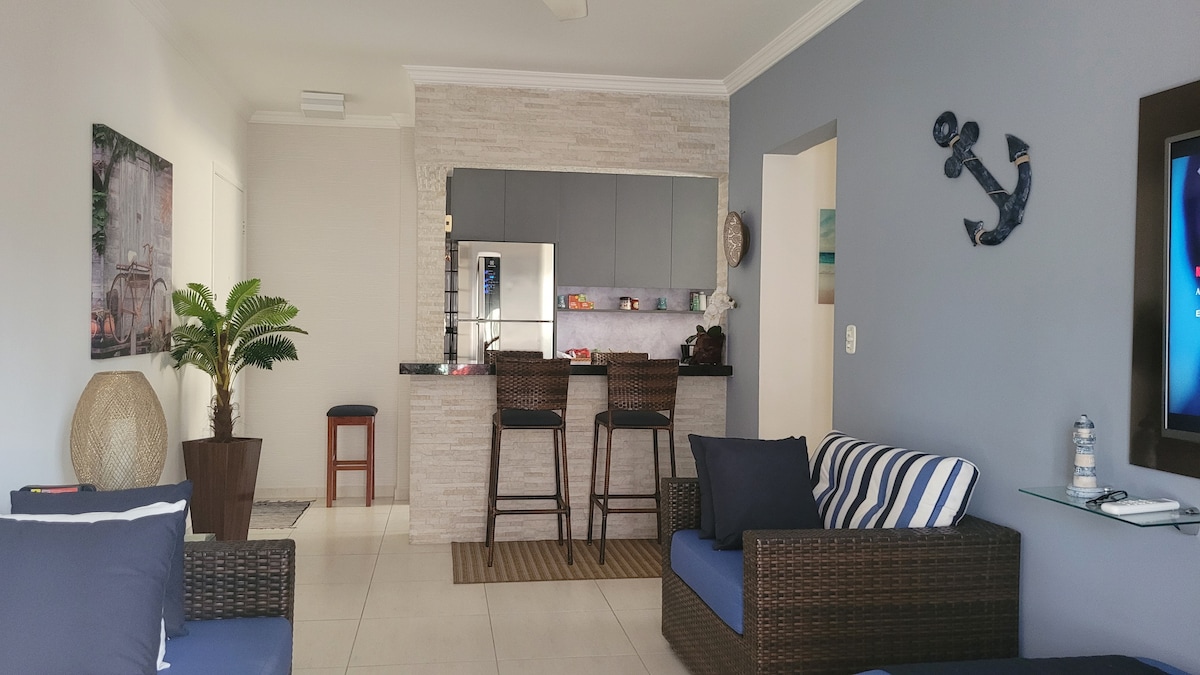 Enjoy the serenity of the seaside in this cozy apartment in Pitangueiras Guarujá. With stunning panoramic views it offers beach service, modern décor, new appliances and kitchenware, and a garage. Relax in the bright living room or on the balcony with the best ocean views. A fully equipped kitchen and a 55-inch smart TV are included. Whether for a family vacation or a romantic getaway this seaside retreat is the perfect choice. Book now and immerse yourself in the beauty of Guarujá's best beach.