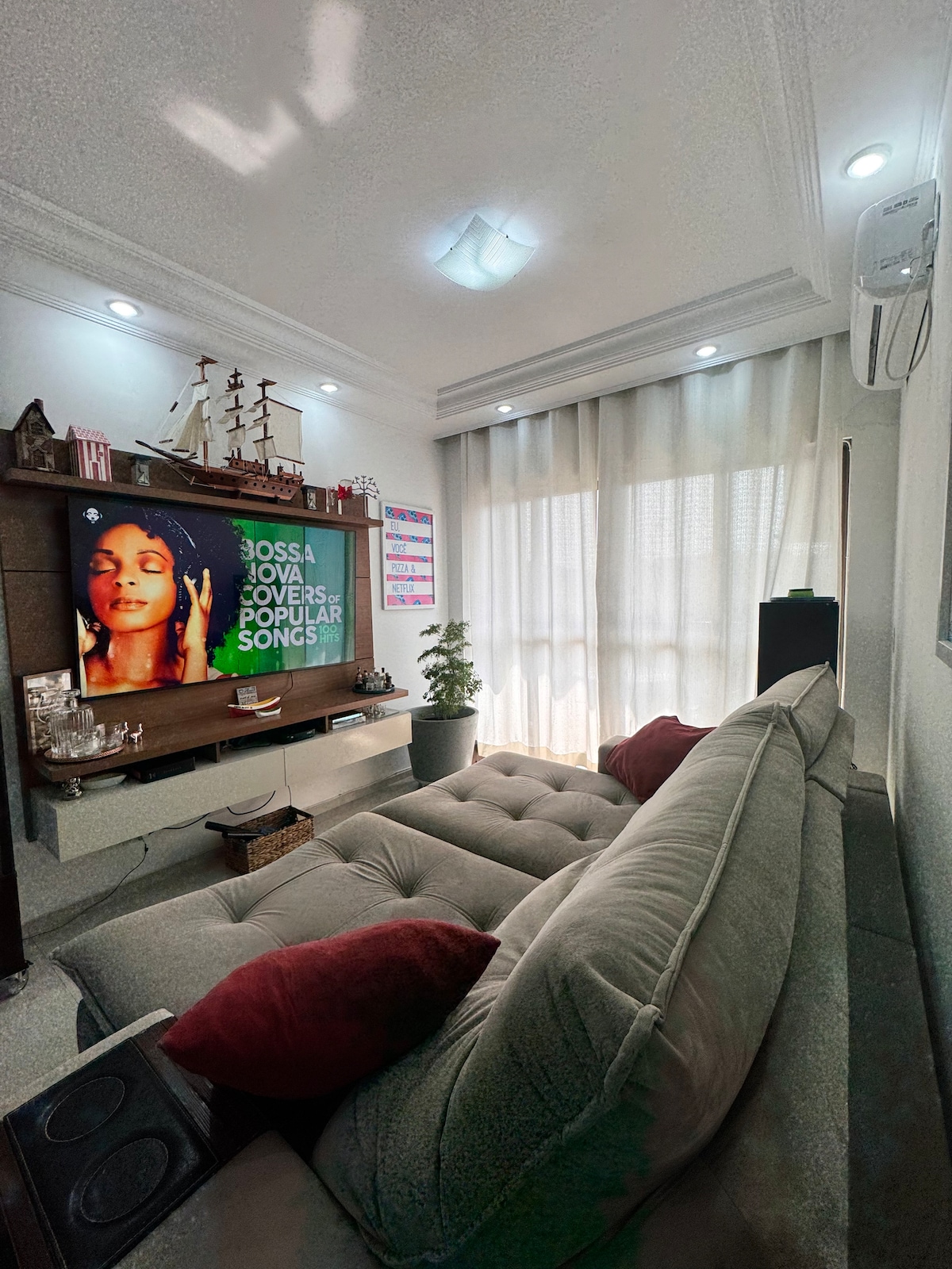 Apartamento com 56metros quadrados.Espaçoso,muito iluminado e arejado.Possui banheiro grande.Cozinha com panelas ,assadeiras,pratos, copos,talheres,cafeteria, garrafa térmica. Liquidificador, geladeira, fogão, mesa e cadeiras.Tudo que necessitar para preparar suas refeições.O quarto possui guarda roupa,cabides,espelho grande e ventilador de teto.A sala também possui ventilador de teto, ar condicionado, TV . Tem também ventilador portátil.
