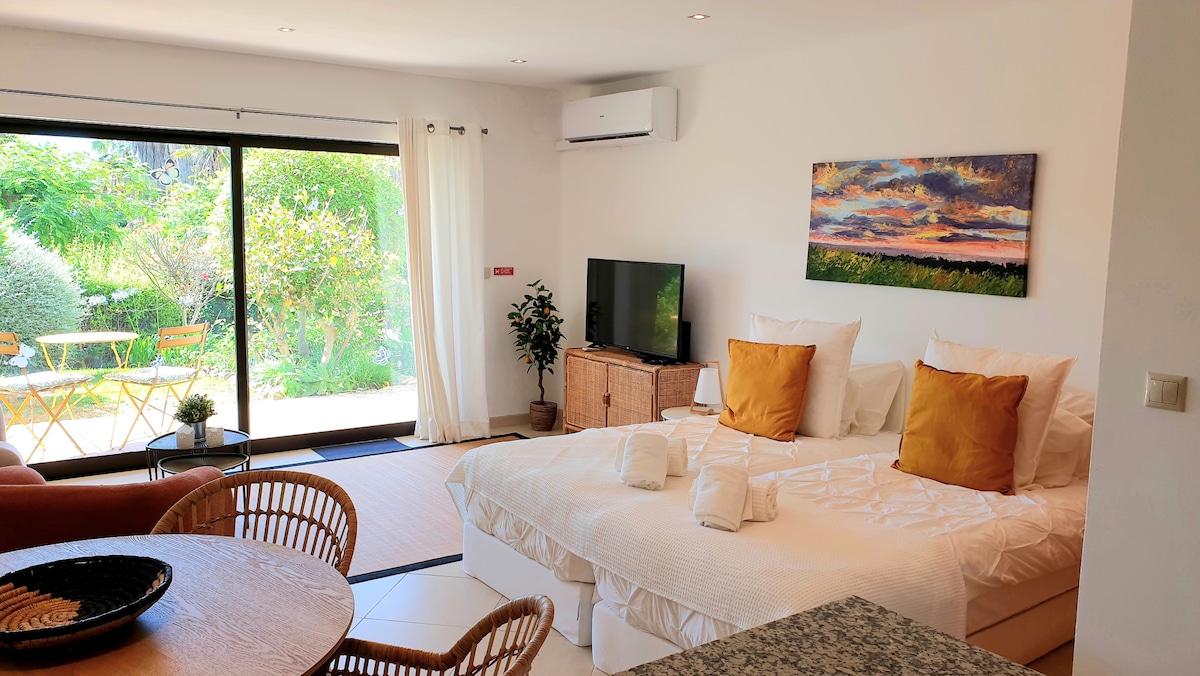 Modern studio apartment located in a picturesque seaside area. Located within 500m walking distance to the renowned São Rafael Beach, and 500m walking distance to the picturesque Arrifes beach. The private condominium has a newly 2024 refurbished swimming pool for adults and one for children. A bar is also present in the premisses offering snacks and great cocktails. The apartment itself is equipped with WIFI (1 Gbps), Smart TV and has all the necessary amenities for a comfortable stay.