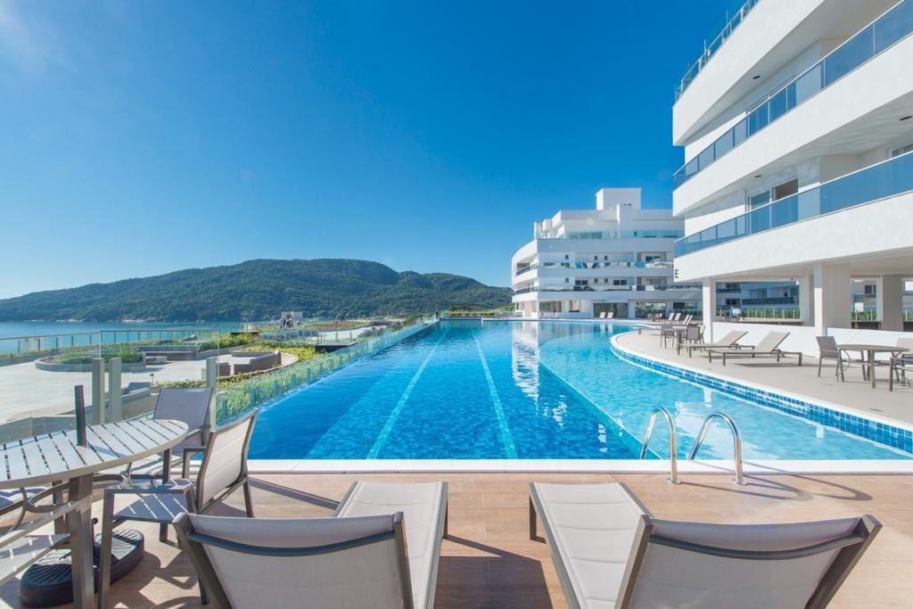 Cobertura EXCLUSIVA com JACUZZI AQUECIDA na sua ampla ÁREA EXTERNA PRIVATIVA, iluminação noturna especial e VISTA LIVRE. Localizada acima das construções vizinhas, garante total privacidade e uma vista deslumbrante para as dunas e a Praia do Santinho. O condomínio fica em frente à Praia dos Ingleses — é só atravessar a rua! Aproveite também a piscina de borda infinita do condomínio com vista para o mar.