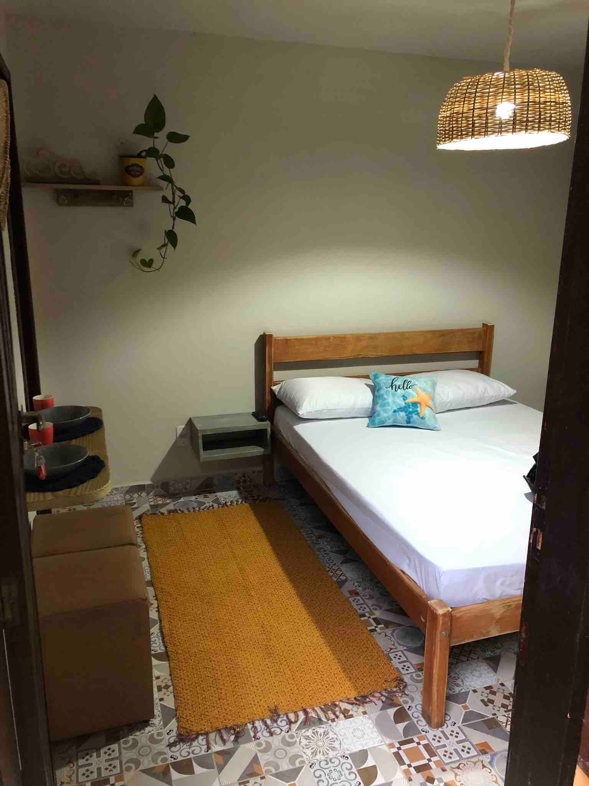 Suite para casal com banheiro privativo, cama box de casal, frigobar, chaleira elétrica, wi-fi, tv, o quarto tem saída externa independente ( vc não passa pela casa), oferecemos copos pratos e talheres, chaleira elétrica,mas não tem cozinha para compartilhar, temos mesa para refeição.