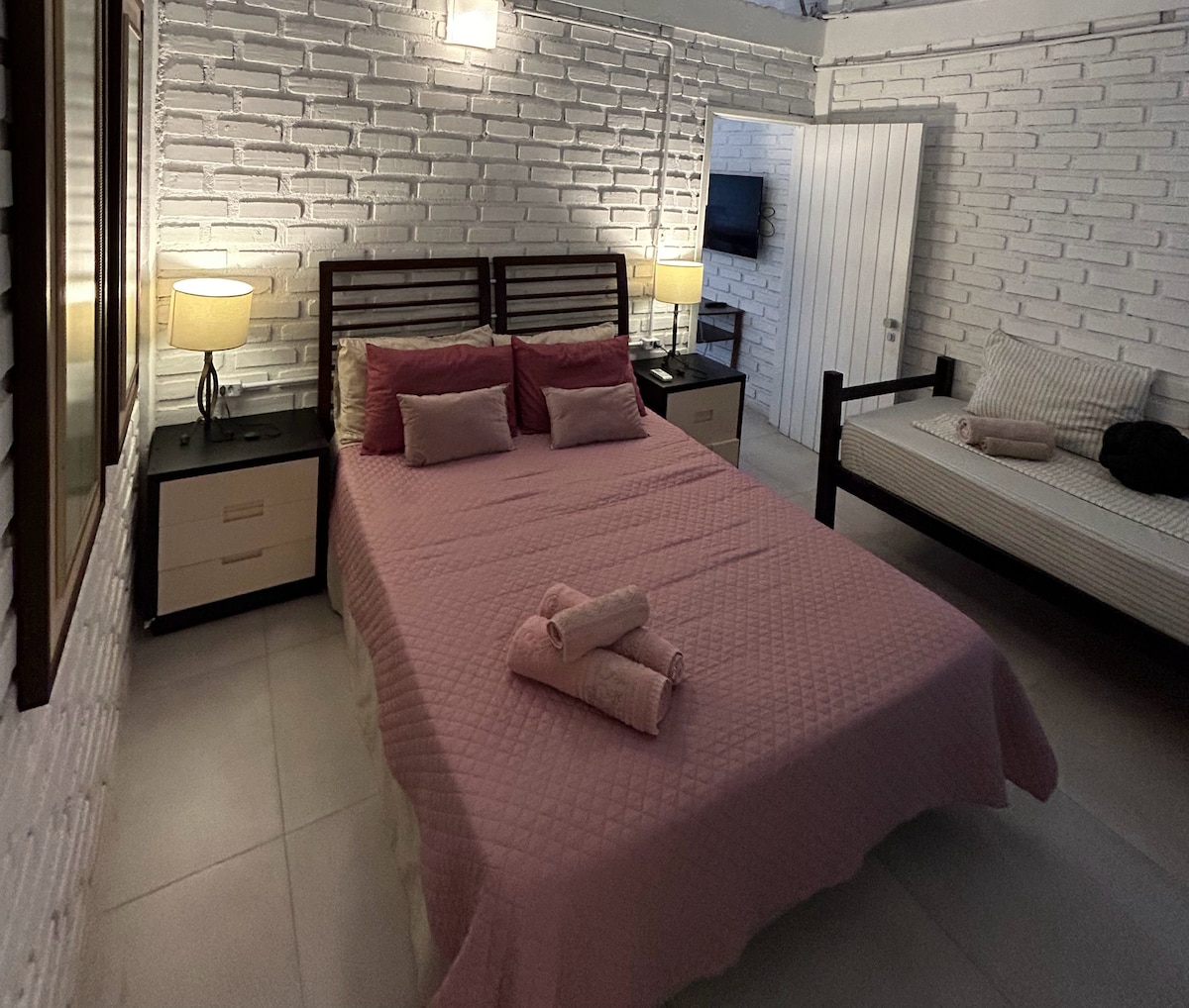 Na sala há um sofá cama, que acomoda confortavelmente 2 pessoas.