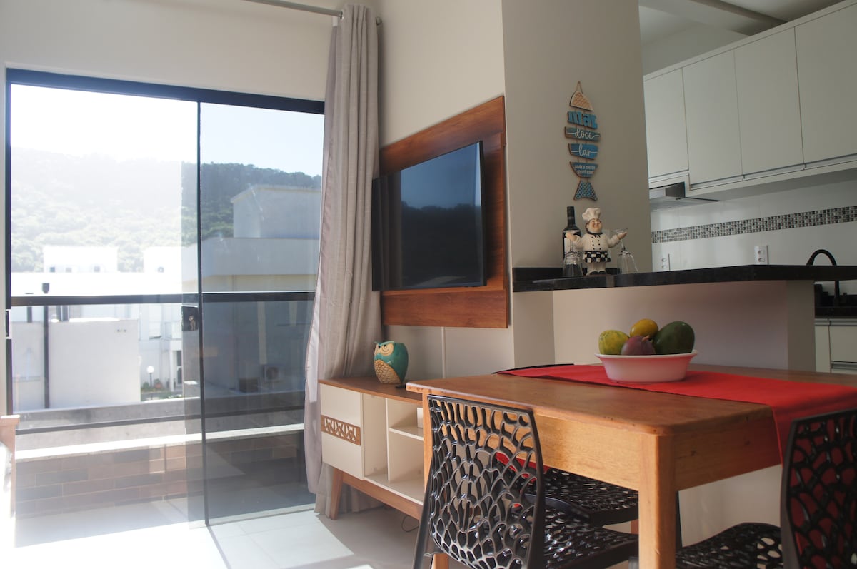 O Apto está localizado no ponto mais nobre dos Ingleses, em local tranquilo e perto da praia. Possui dois quartos, sendo uma suíte com cama de casal, ar condicionado e TV e um quarto com duas camas de solteiro e ar condicionado. Sofá-cama na sala de estar com ar condicionado e TV smart. Lavanderia com máquina de lavar roupa e sacada com churrasqueira. Vaga de garagem coberta e prédio com elevador.