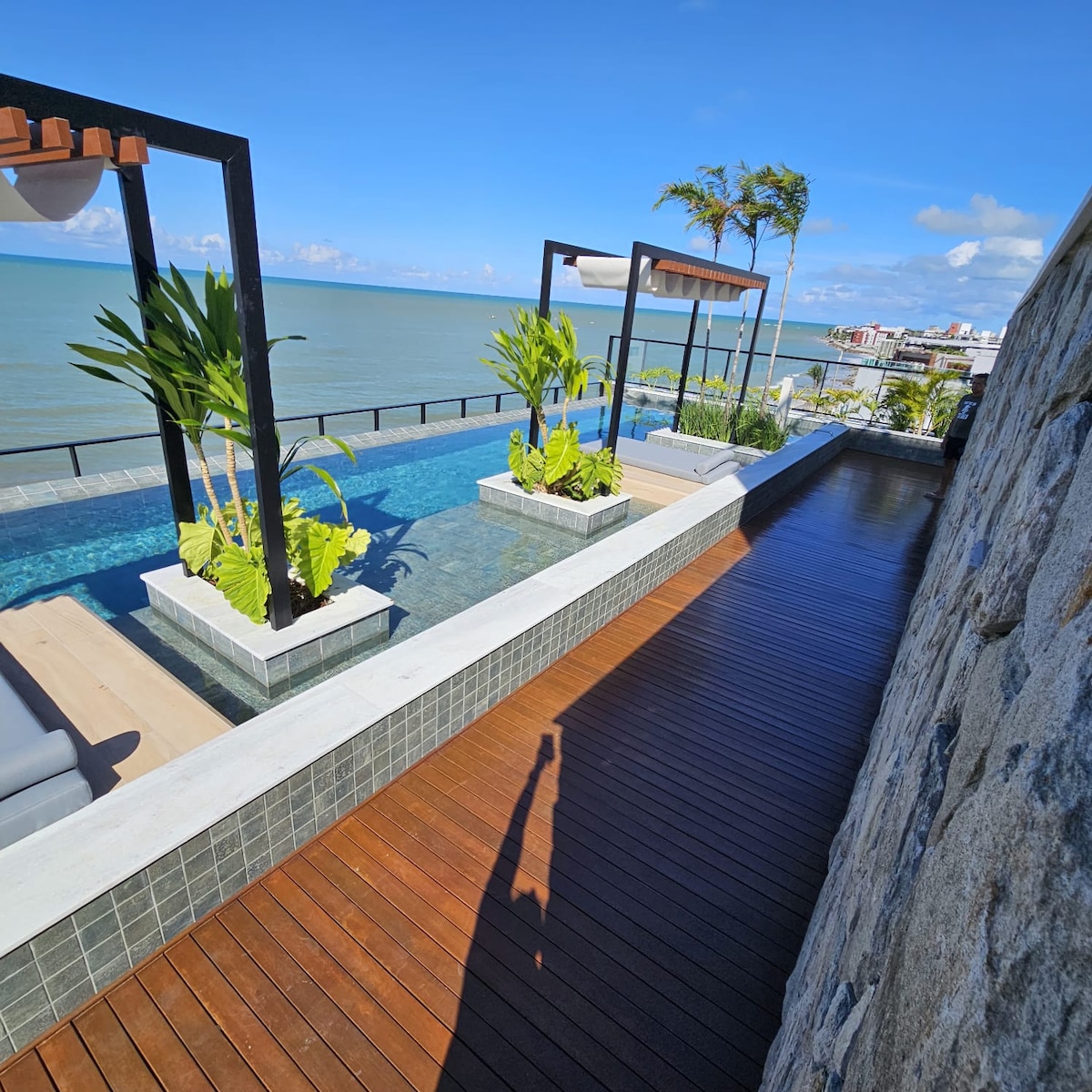 Apartamento no 2º andar de um moderno prédio à beira-mar da Praia de Cabedelo. Ideal para até 2 pessoas, conta com cama de casal e sofá-cama, smart TV, Wi-Fi e cozinha equipada. O edifício oferece piscina no rooftop com vista paradisíaca para o mar e o rio, espaço gourmet com churrasqueira, academia, lavanderia, brinquedoteca, salão de jogos e portaria 24h. Localização privilegiada, próximo a restaurantes, bares, mercados, farmácias e padarias. Conforto e praticidade à beira-mar.