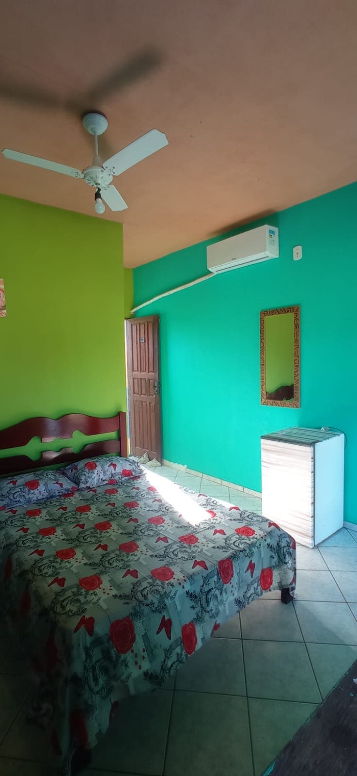 Casa com 2 quartos, sendo 1 suíte, 2 banheiros, apenas 1 chuveiro elétrico, chuveiro no quintal, cozinha equipada e ventilada, vagas para 4 carros, 2 camas casal e um colchão casal extra, 3 ventiladores, não temos ar condicionado, menos de 2 minutos caminhando para praia.