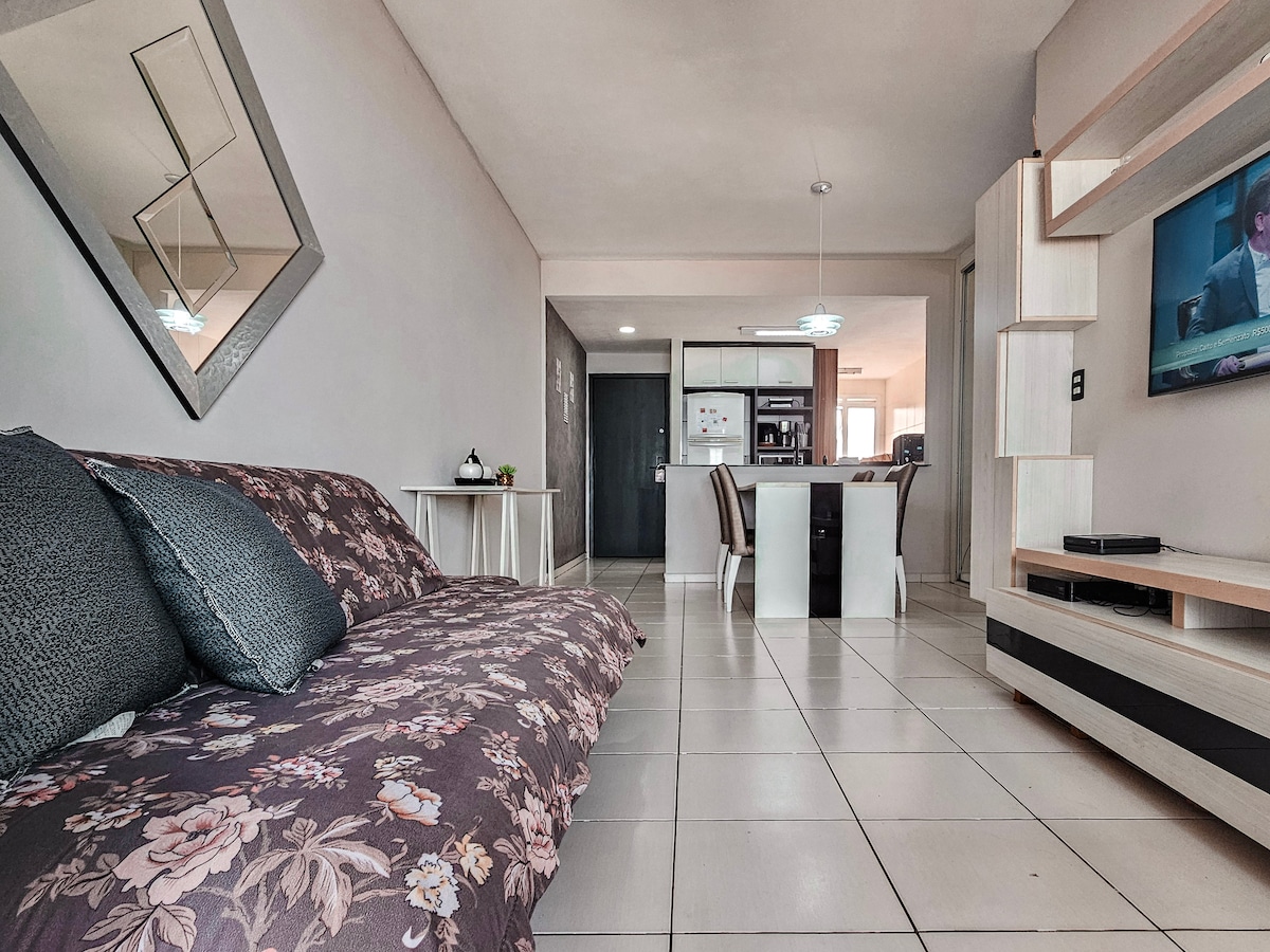 Apto. claro, todo no porcelanato e bem ventilado. São 02 quartos sendo uma suíte e outro quarto com 03 camas de solteiro. Tenho também um sofá cama na sala que acomoda 02 pessoas, porém, perde conforto devido o sofá aberto na sala, mas posso acomodar até 07 pessoas. Oferecemos duas TVs, espelhos grandes, ventiladores, fogão, microondas, cafeteira, garrafa térmica, torneira com filtro, refrigerador, liquidificador, panela elétrica de arroz, panela de pressão, aspirador de pó, Cooler.
