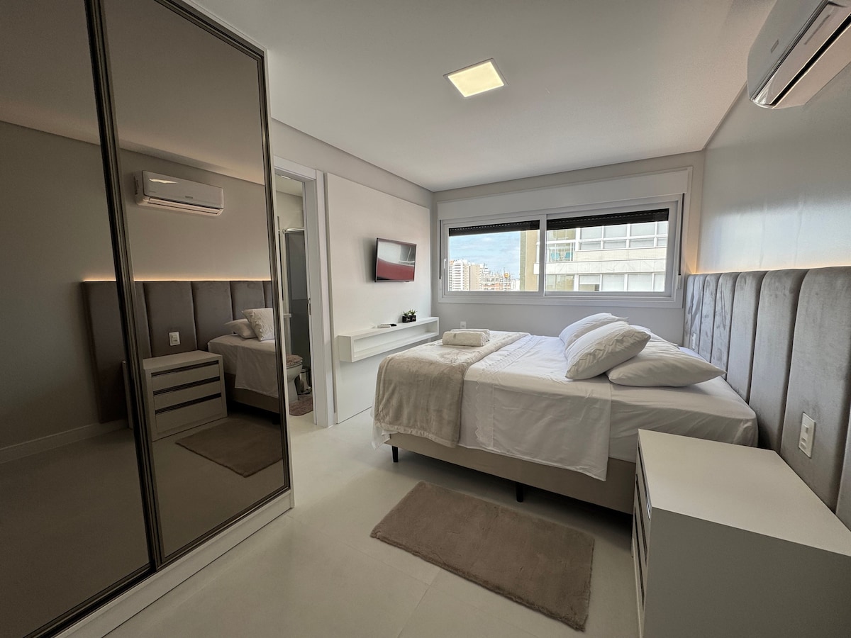 Apartamento de luxo há alguns passos da praia. *** Apartamento com 3 dormitórios, com split em todos os quartos e na sala*** Apartamento completo com churrasqueira, garagem, TV de 70 polegadas na sala e TV de 60 polegadas na suíte principal, Internet 500 mega, split, maquina de lavar roupa, Sky, Netflix, Disney+, HBO+... Agora temos também Roupas de cama para facilitar sua hospedagem e cadeiras e guarda-sol. Aceitamos pets de pequeno porte!