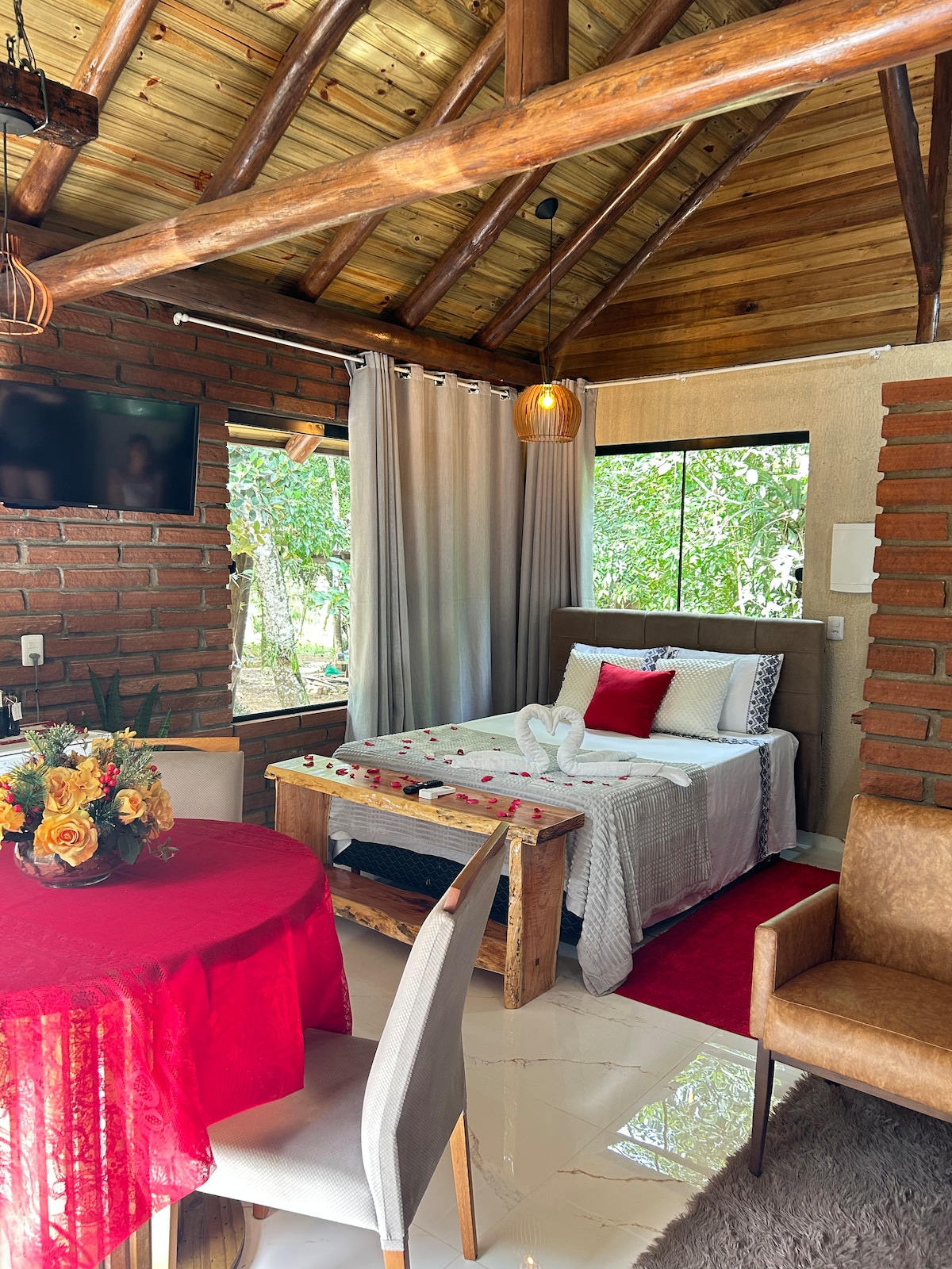 Relaxe neste lugar único, aconchegante e tranquilo, em meio à natureza. Nosso Bangalô Sonho está localizado na área rural, distante apenas a 4,5 km do centro da cidade. O espaço possui cama queen, SmartTV 32", ar condicionado inverter, secador de cabelo, chuveiro a gás, torneiras com água quente, cozinha equipada com frigobar, microondas, cooktop, torradeira, chaleira elétrica e utensílios domésticos. Temos Wi-Fi. As paredes têm isolamento térmico. Não são permitidos Pet e churrasqueira.