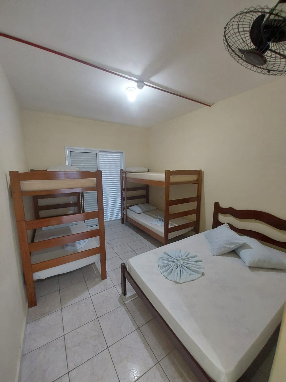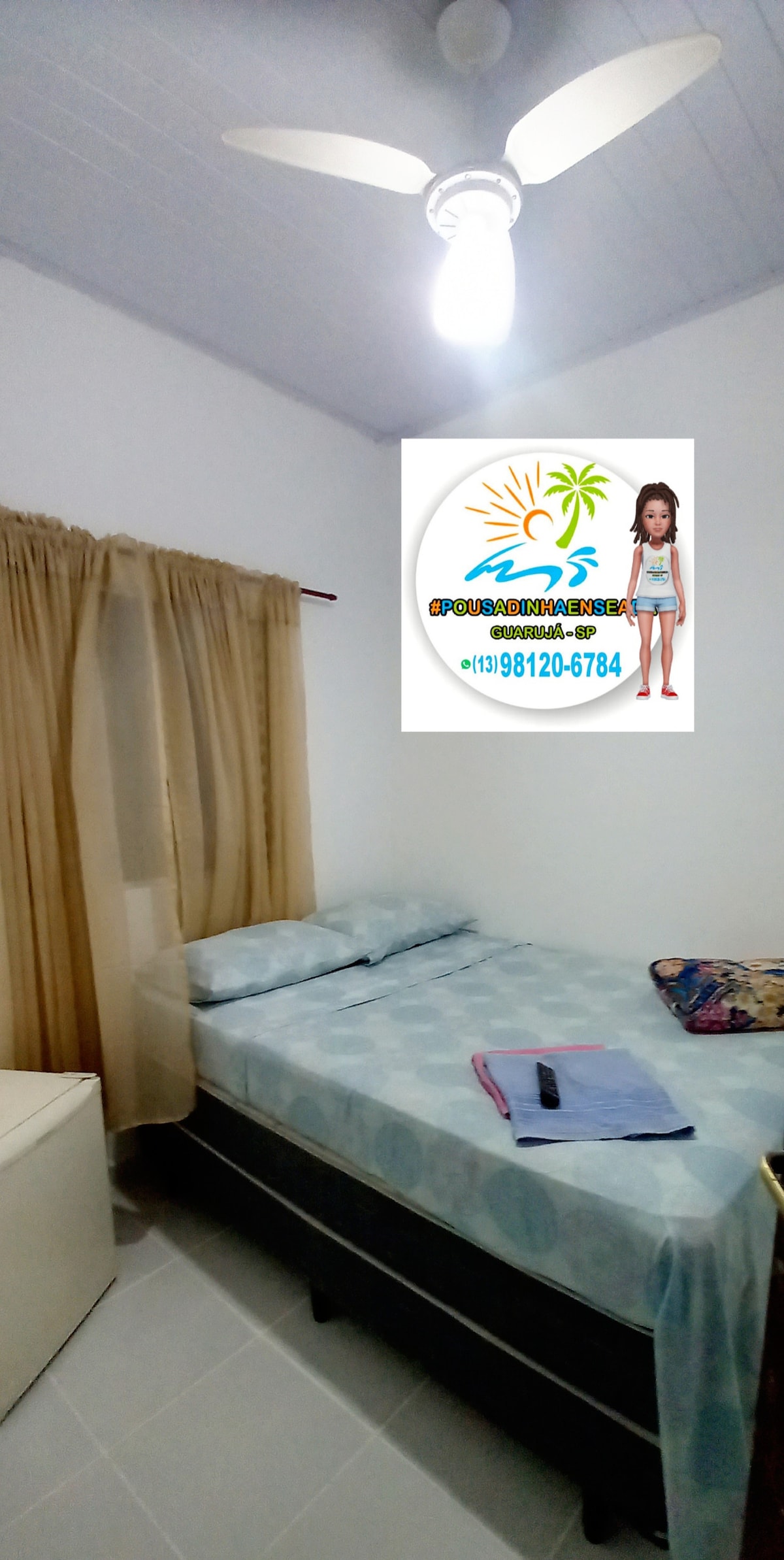 quarto de uma pousada nova que cabem ate 4 pessoas em uma cama de casal e cama solteiro auxiliar a pousada fica a 200 metros da linda praia do guaiuba el Guaruja o.quarto possui banheiro privativo e se pode usar a cozinha da area comum temos umngrande e relaxante patio com redes e rodeado pela natureza com passaros macacos dentre outros a pousada fica de frente para uma mata densa de muito verde e com.varios animas silvestres aproveite para passar días para relajar