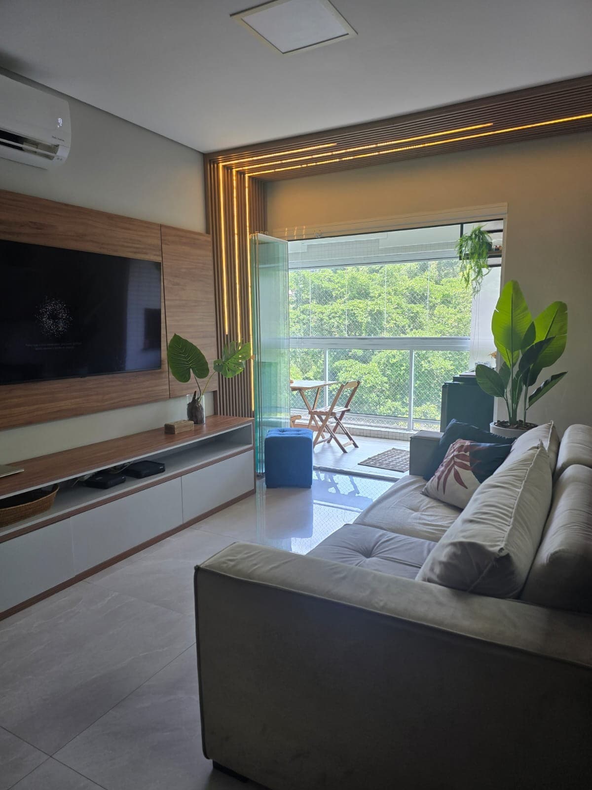 Apartamento moderno com ar condicionado na sala e no quarto, cozinha equipada, fogão, forno, microondas, Smart TV, Netflix, Wi-fi, e ampla varanda com vista exuberante para a praia de Santos. O condomínio conta com uma completa área de lazer com duas piscinas incríveis, uma aquecida e outra com borda infinita frente ao mar.