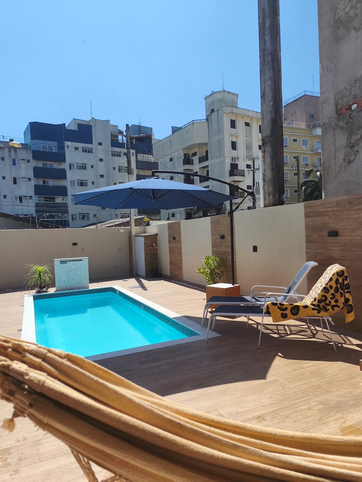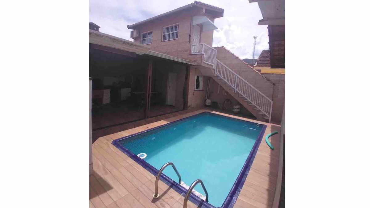 Ambiente familiar em uma área tranquila no Guarujá acomodação para 6 pessoas área de lazer, esnuk, pebolim , churrasqueira uma linda piscina de 6 metros 1 quarto com cama casal e uma Beliche, bicama ,rede ,cozinha completa , ventiladores nos dois comodos ar condicionado , 1 banheiro inteiro dentro da casa e um lavabo na área externa da casa.