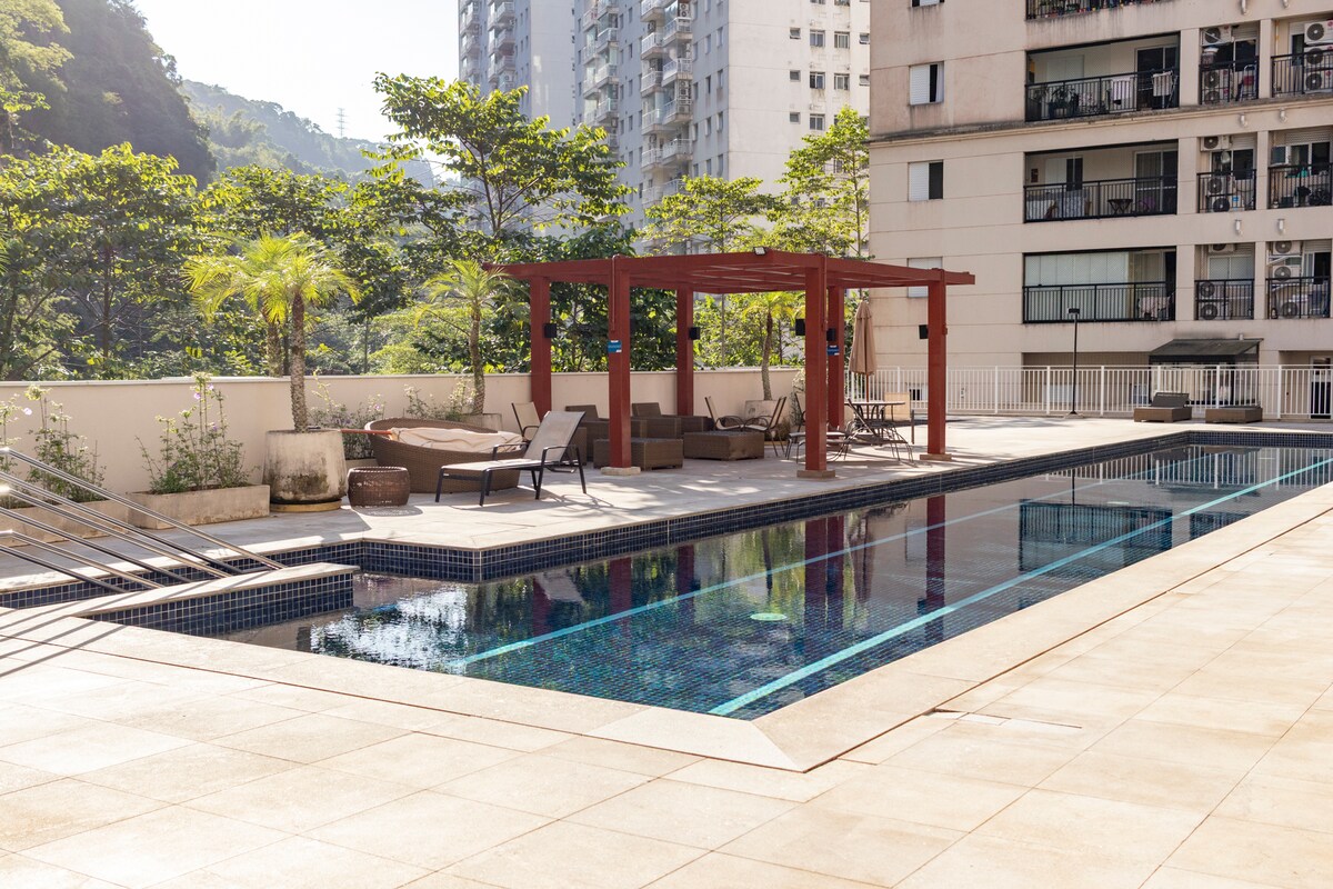 Premium Beach Club Enseada, Guaruja. Comfortable apartment for 6 people (suite, double bedroom and single bedroom), plus a double sofa bed in the living room. 2 parking spaces, air conditioning in all rooms, gourmet balcony, high-speed Wi-Fi, plus a Resort Club on the beach, all for you. Security system for excess energy. Resort with large swimming pools, sauna, gym, pilates, beach tennis, cinema, co-working, jacuzzis, and zen space. Impeccable and wonderful space! 3 minutes walk to the beach.