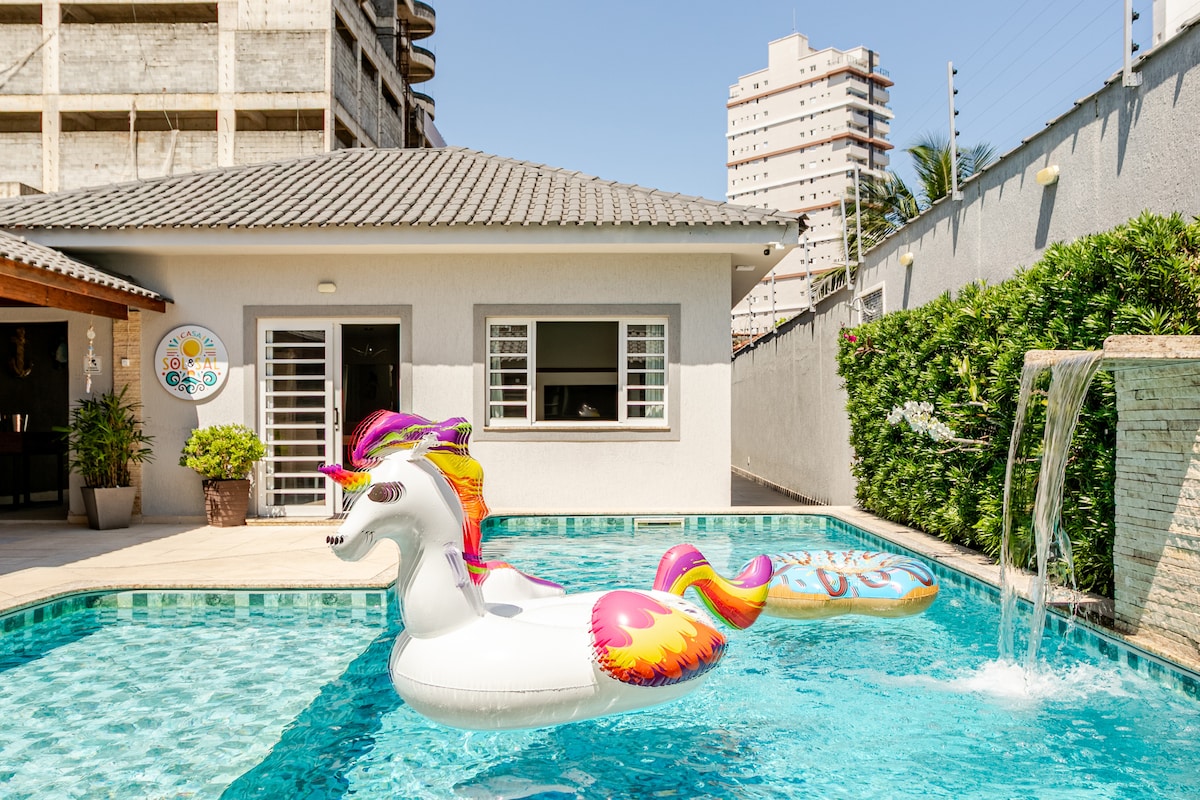 Casa Sol & Sal: Venham curtir a casa com piscina climatizada na Guilhermina, Praia Grande/SP, 600m da praia. Perfeita para momentos de descontração e lazer. Ampla (244m²) e decorada, 4 quartos, sendo 3 suítes (uma com banheira e 2 chuveiros), acomoda até 15 hóspedes. Ar‑condicionado, Wi‑Fi, Smart TVs nos quartos, salas e área da churrasqueira. Mesa de sinuca, pebolim, ping‑pong e muitos jogos. Máquina de gelo, air fryer, bebedouro refrigerado. Garagem p/3 carros. Pet friendly (1 pet) e berço.