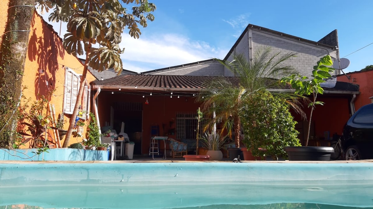Linda Casa em Mongaguá, a 90 metros da praia. Excelente espaço externo com piscina, churrasqueira/forno e fogão a lenha para fazer aquele churrasco ou aquela comida com muita diversão na beira da piscina. Sala de estar com Mesa de sinuca e tampão de ping pong. Internet WI-FI NETFLIX Sistema de alarme Total de 3 quartos (sendo 4 camas de solteiro e 2 de casal, com mais 7 colchoes a parte). Casa conta com 3 banheiros no total. Casa terreá, excelente para pessoa com mobilidade reduzida.