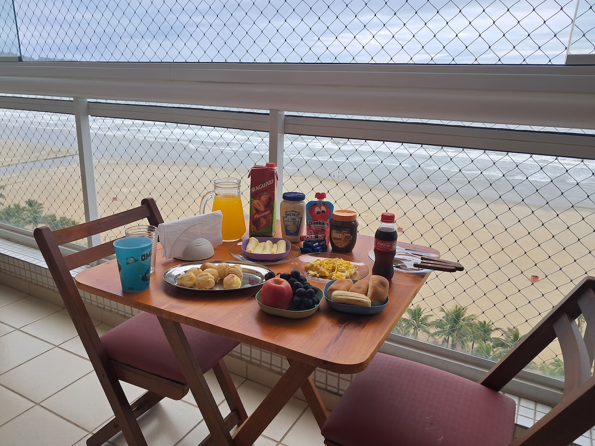 Vista frente mar total maravilhosa em um lindo apartamento decorado frente mar total 2 dorms, (1 suíte). Ar condicionado. O mais belo e encantador nascer no sol, juntamente com o delicioso barulho do mar! Você irá sentir uma paz e ficará encantado com essa experiência! Além disso tenha o privilégio de presenciar o pôr do sol frente mar numa sala de estar e jantar linda com ar condicionado, móveis de altíssima qualidade, tvs smart, cafeteira Nespresso, cozinha completa com fogão indução.