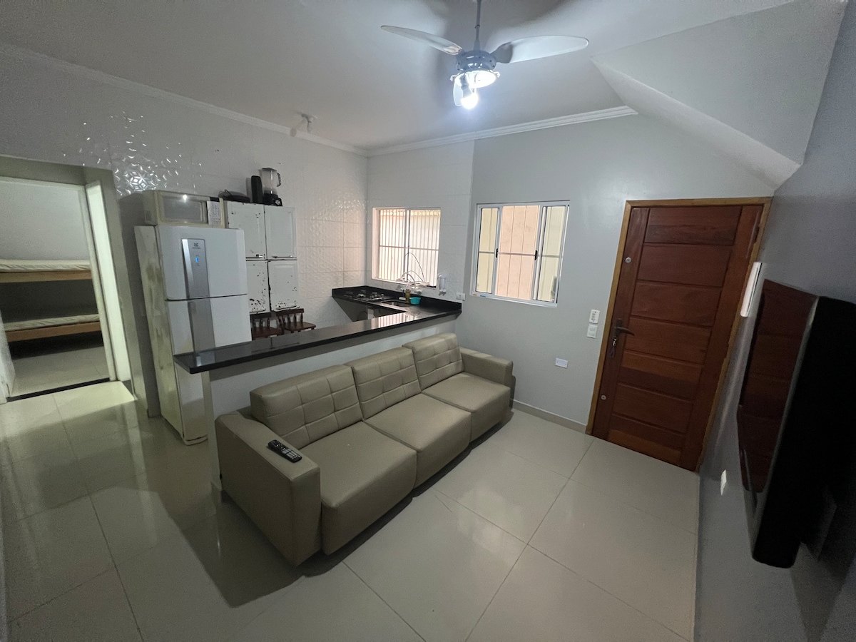 Casa em Praia Grande/SP - Praia do Jd. Real. 900 metros da praia do jardim real - 20 minutos indo a pé 5 min de carro. Casa climatizada com muito conforto. Ideal para quem quer sossego e praia ao mesmo tempo. 1 quarto, sala/cozinha americana, banheiro e 1 vaga na garagem. Permitido trazer animais Possui churrasqueira 900 metros da praia Jd. Real