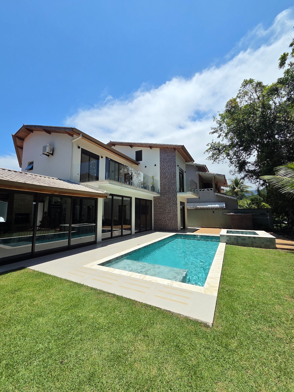 Casa em condomínio fechado na Barra do Sahy com 400m2, 4 suítes, 1 lavabo e capacidade de acomodar 8 pessoas confortavelmente. A casa está em ótima condições e é extremamente charmosa, espaçosa e bem decorada, com uma vista fantástica de todos as salas e quartos para a praia. É uma casa bem arejada e fresca pois possui pé direito alto e janelas de vidro grandes ao redor de todo o ambiente. Terraço com piscina, churrasqueira e mesa externa. Segurança 24h. Wifi fibra ótica de alta velocidade.