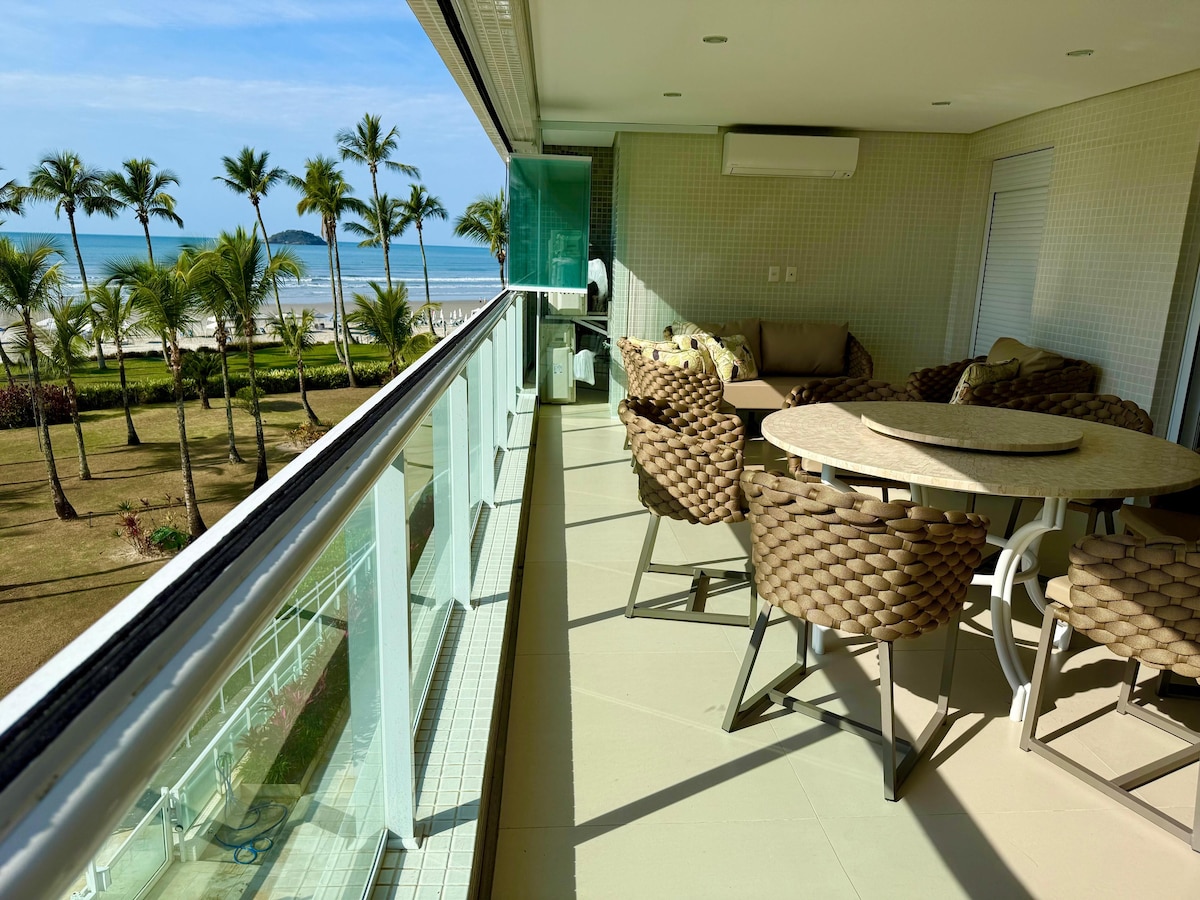 Apartamento 263 m2 de frente ao mar, com fantástica vista para toda a praia de São Lourenço e da Riviera. Grande varanda fechada com vidros circundando todo apartamento. Com 4 quartos, sendo 2 suítes, todos com armários embutidos. Ar condicionado em todos os cômodos. Televisão e acesso a internet de 120 mega. Excelente sala de jantar e cozinha conjugados com mesa p/+de 10 pessoas. Churrasqueira e mesa na varanda. Condomínio com grande conjunto de piscinas, academia e sauna. 3 vagas de garagem.
