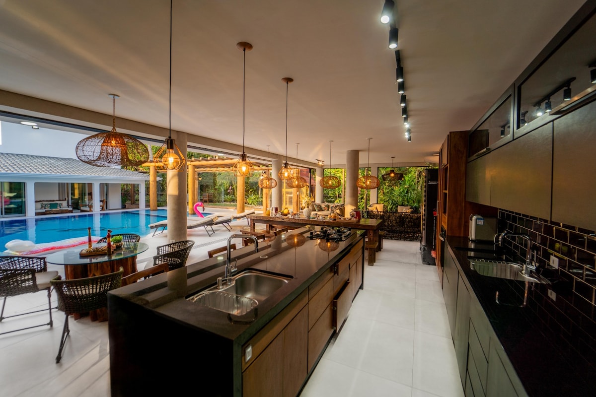 Casa em condomínio fechado, decoração charmosa moderna rústica, a apenas 7min da praia caminhando e 2 min dos principais restaurantes e SM. Rodeada pelo verde da Mata Atlântica, recém reformada, 3 vagas de garagem, 3 suítes de casal que acomodam confortavelmente até 6 pessoas e 3 crianças. A cozinha é para quem aprecia se entreter com familiares e amigos enquanto cozinha, pois é integrada com a sala bem ampla, churrasqueira e piscina privativa. Dias frios temos lareiras e dias chuvosos sala TV.
