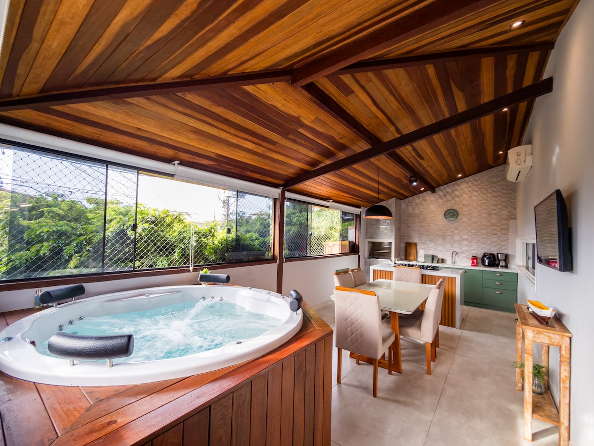 Cobertura espaçosa! Próximo das principais praias de Búzios e do Centro (Rua das Pedras). Cozinha americana em conceito aberto, sala de jantar e estar integradas com tv de tela plana de 50", cozinha externa, área gourmet (churrasqueira), terraço amplo e fresco com área social (sofá, mesas e rede). Banheiro interno e externo + 1 lavabo . 1 Quarto aconchegante: cama queen, ar condicionado e tv a cabo. Mezanino: 1 cama de casal, 2 camas de solteiro, 1 sofá cama, ar condicionado, tv e lavabo.