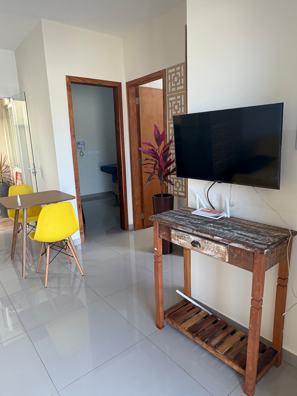 O Estúdio Surfe é um espaço organizado para fazer um churrasquinho ou um jantar depois daquele dia na praia, que fica bem na frente da propriedade. Também possui um terraço com vista panorâmica para o mar! ATENÇÃO: Não oferece roupas de cama e banho. Os travesseiros e colchões são ofertados com capas protetoras. Algumas áreas podem ser compartilhadas como os pátios, o terraço e as garagens. OBS: Possui 1 vaga de garagem. Oferece cadeiras de praia, cooler e carrinho de praia.