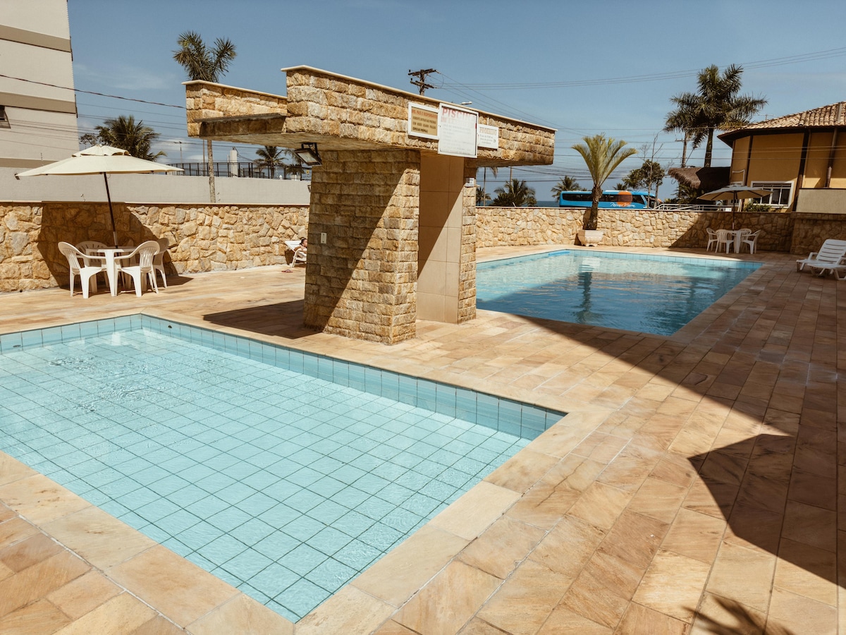 A temporada de chuvas acabou, venha desfrutar do clima ameno com toda infraestrutura que precisa, apto familiar completo, praias com quiosques preparados para receber você, aproveitem as férias ou fim de semana a beira mar. Praticidade de ir a praia a pé, cadeiras, guarda sol, sombra, tudo no conforto dos quiosques. Sou o melhor custo benefício da região(conforto, qualidade, segurança e valor justo por pessoa), locação de todos os cômodos. Se agregar alguém pagamento a parte, venham conhecer!!
