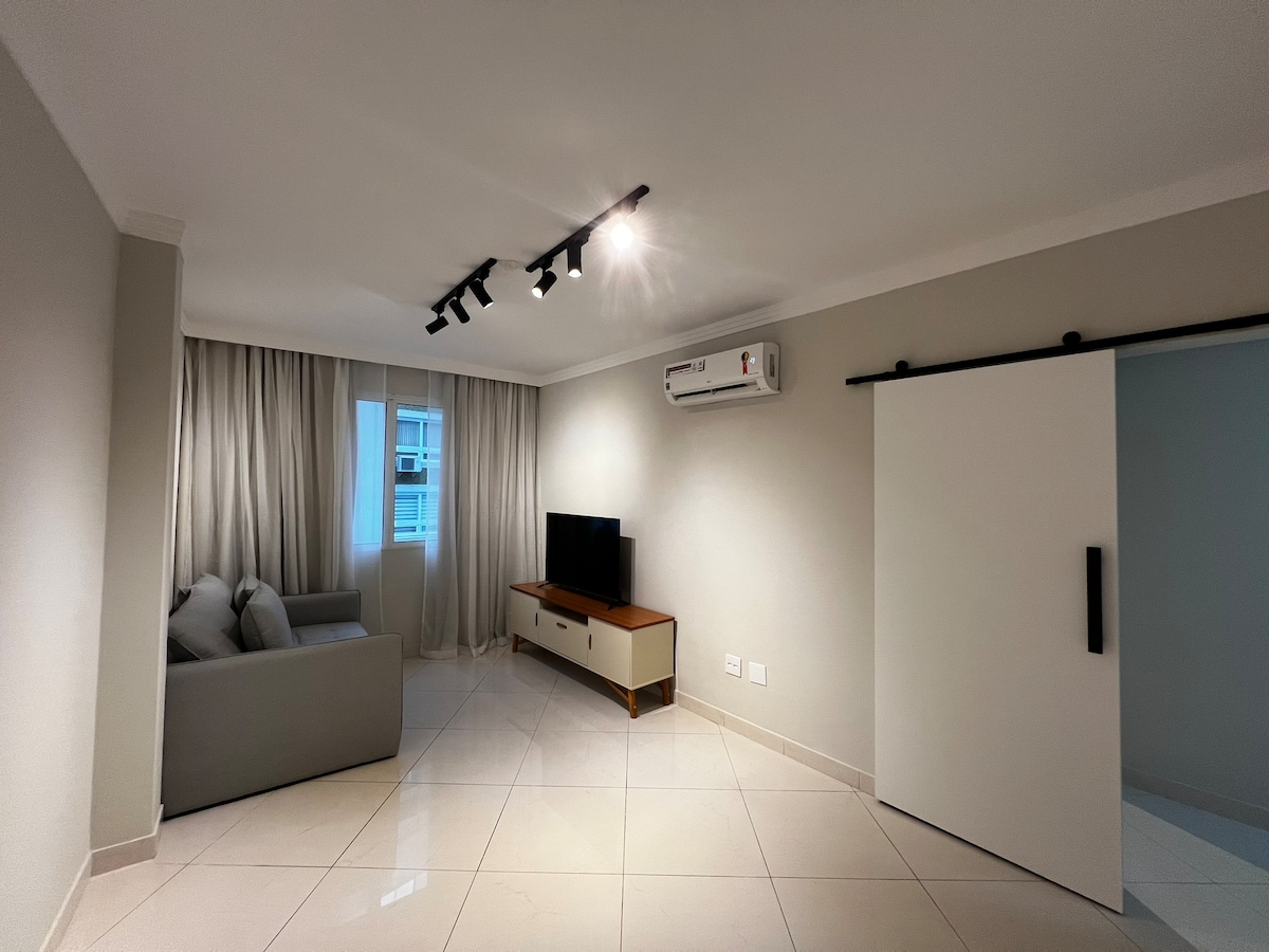 O apto está localizado no coração do Gonzaga, o bairro mais nobre e querido de Santos, há apenas 3 minutos a pé da praia e de 3 shoppings e de um comércio variado, a gastronomia é um show à parte! São 69m²: uma suíte com hidromassagem e uma sala com porta individual dando opção para segundo quarto. Conta ainda com banheiro social e uma cozinha completa! O espaço foi totalmente reformado e mobiliado, com móveis de qualidade e eletrodomésticos novos, incluindo ar-condicionado em todos ambientes.