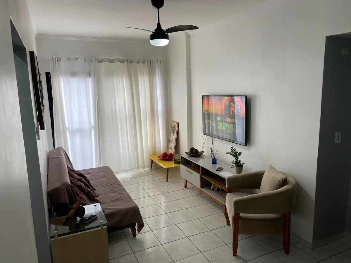 Apartamento charmoso com vista pro mar! Fica apenas 200 metros da areia. Com internet Wi-Fi de fibra ótica e Smart TV. O apartamento fica em Praia Grande na Nova Mirim. Perfeito para quem curte praticar esportes, caminhar no calçadão, andar de bicicleta, pegar uma praia ou trabalhar Home Office com a brisa do mar. Fornecemos toalhas de banho limpas e roupas de cama. Atualmente a piscina não está disponível para uso.