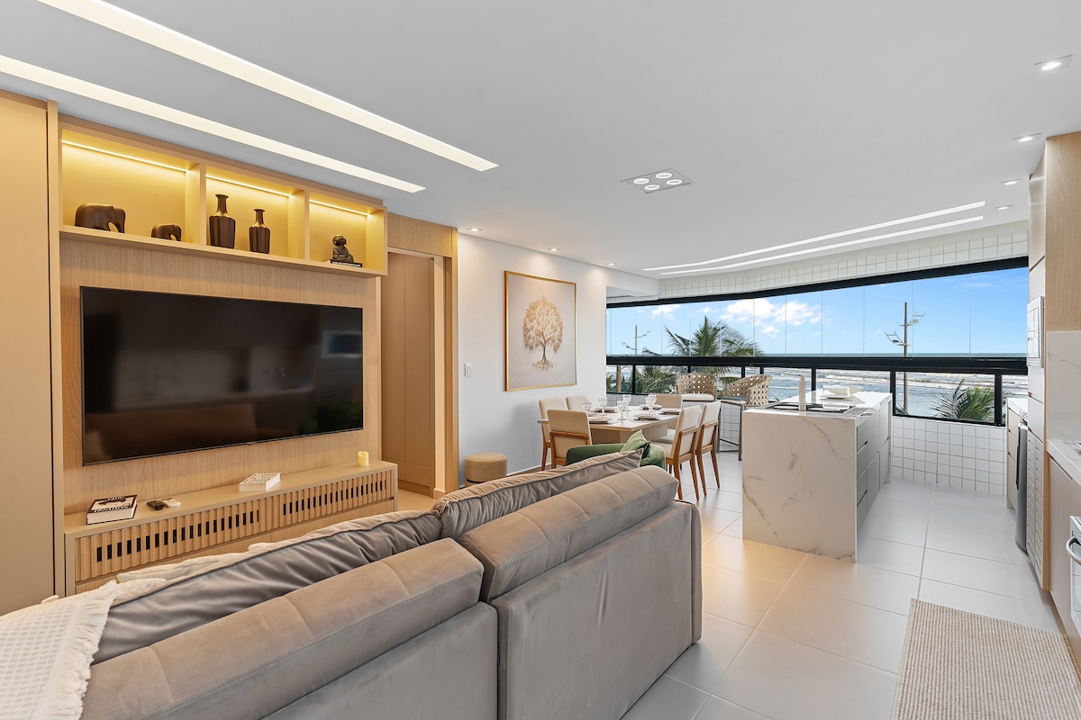 Lindo apartamento com 2 quartos (1 suíte), ar condicionado em cada quarto, TV na sala e na suíte; Wi-fi, cozinha completa; máquina lava e seca. Todos os cômodos do apartamento têm vista ampla para o mar (sala, lavanderia, cozinha e os dois quartos). Energia 110 e 220; Prédio conta com piscinas, saunas (seca e úmida), jacuzzi, sala de jogos, brinquedoteca, parquinho, academia, serviço de praia (cadeiras e guarda sol), e limpeza diária simples no apartamento, já incluída. 1 vaga na garagem.