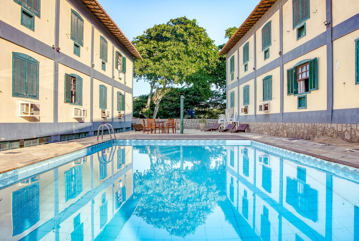 Acomodação para casal em excelente localização, próxima à Praia do Forte, no centro de Cabo Frio. Suíte com banheiro privativo, copa e cozinha. Área de serviço e de lazer compartilhadas com pequena piscina, e churrasqueira.