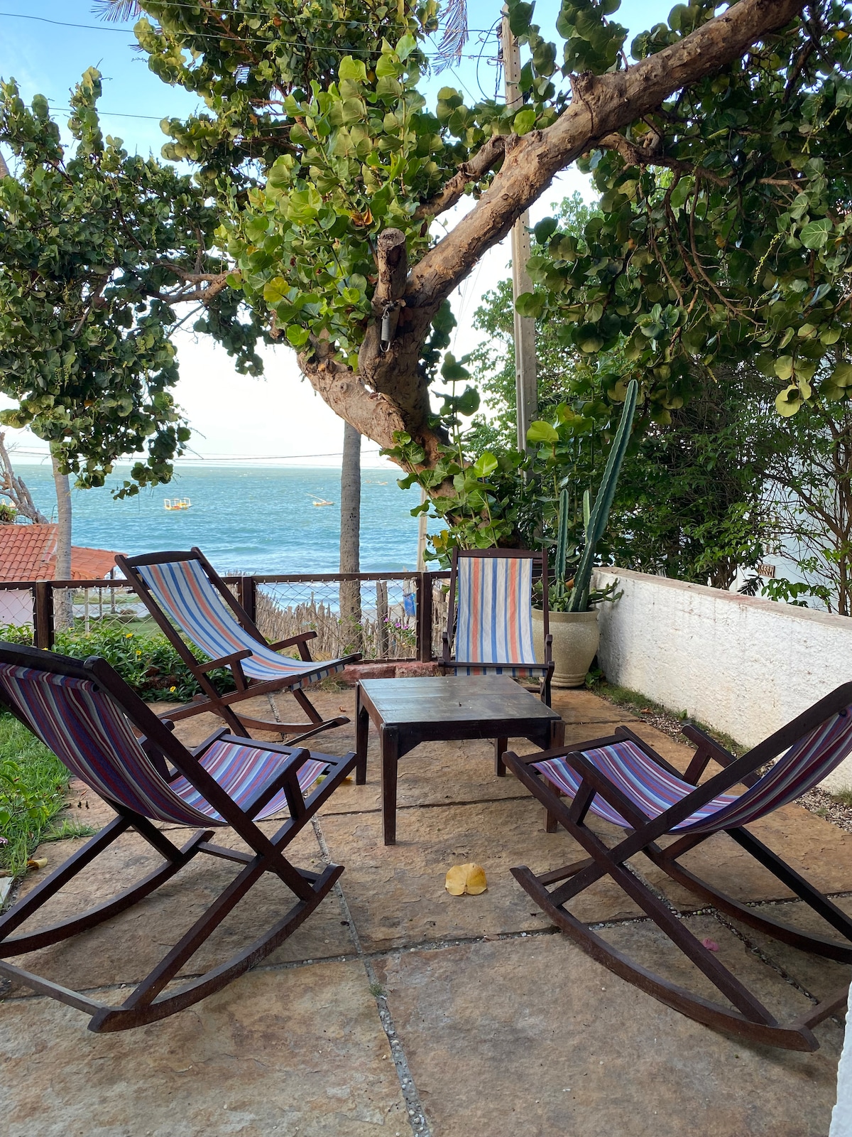 We are proudly renting our holiday home in Praia de Redonda, Icapui. Located, right above the beach, with a spectacular panoramic ocean view. A quiet location in direct contact with nature, to relax and recharge your batteries. Our house lays on huge 530 m² garden with palms, fruit trees and hammocks waiting for you. Only a 10 minute walk from the beach down the hill. We provide fresh bed linen, towels, a fully equipped kitchen and private parking area for your car.