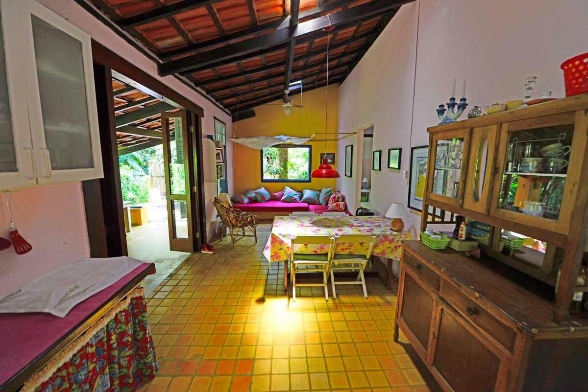 Casa rústica na praia Vermelha do Centro, a 3 minutos do mar, em rua tranquila e sem saída. Ensolarada e cercada por jardim tropical, localizada em meio à Mata Atlântica. São 3 quartos, sendo 1 suíte. Sala integrada à cozinha. Cozinha com geladeira, fogão, liquidificador, panelas, assadeiras e demais utensílios necessários para preparar as refeições. Há internet fibra óptica 350mb. Tv smart 43" É necessário levar lençóis, toalhas e demais itens de uso pessoal. Há travesseiros e mantas.