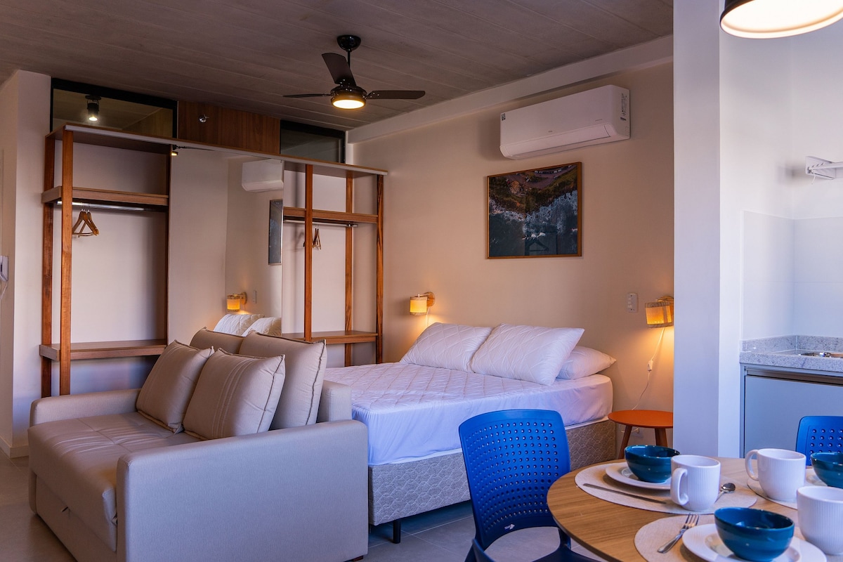 Apartamento novo/reformado, com vista incrível para o mar na melhor localização de Ubatuba. Perto de tudo e ao mesmo tempo em meio a natureza. 1 quarto com cama de casal e vista para o mar Sala integrada com a cozinha Piscina no condomínio. Ar condicionado Wi-fi rápido de 200mb Vaga de garagem Portaria 24h Fica na Prainha do Matarazzo e a 5 minutos da Praia do Perequê-Açu. Moderno e com uma vista paradisíaca. Por estarmos próximos ao Café de La Musique, pode ter barulho nos finais de semana.