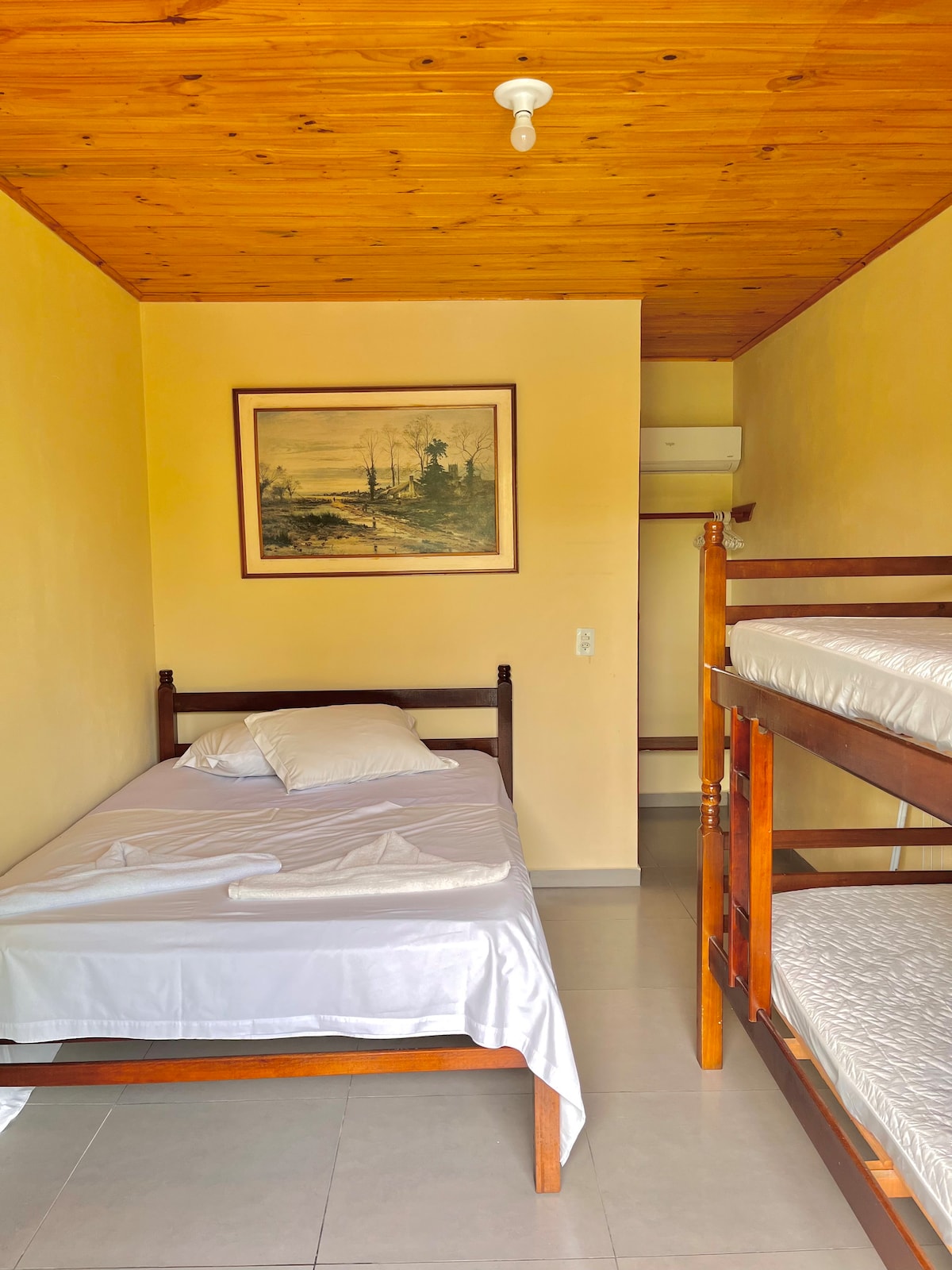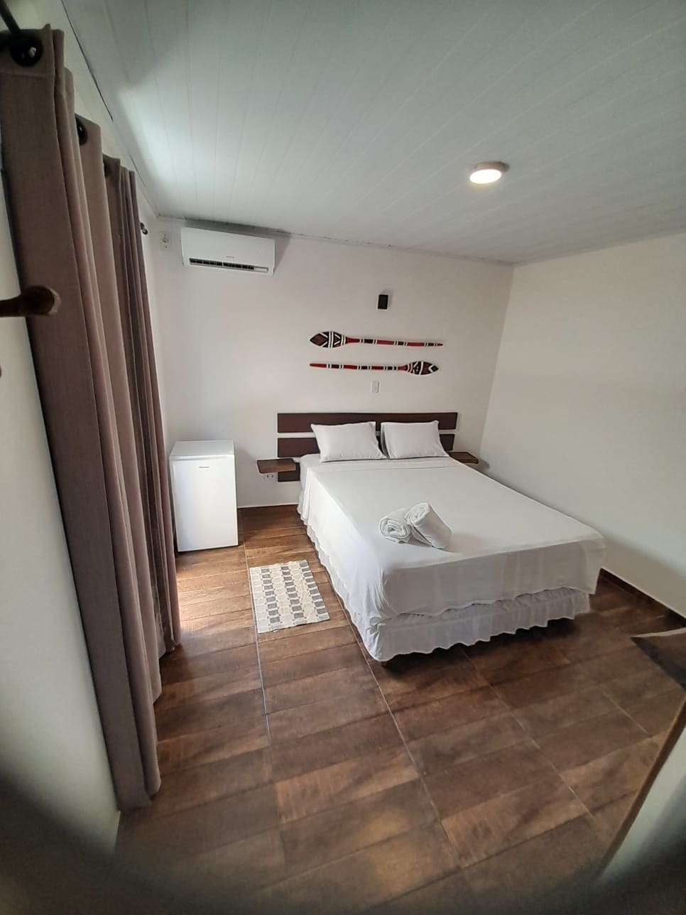 Suíte de hóspedes para 1 casal com varanda, entrada privativa, frigobar e estacionamento O espaço interno é amplo, bem arejado e iluminado, proporcionando uma atmosfera acolhedora e relaxante. Para sua comodidade, a suíte dispõe de frigobar, perfeito para guardar suas bebidas e lanches. Localizada a poucos metros da praia e do rio, a região oferece excelentes opções de lazer, como surf, caiaque e passeios ao ar livre.